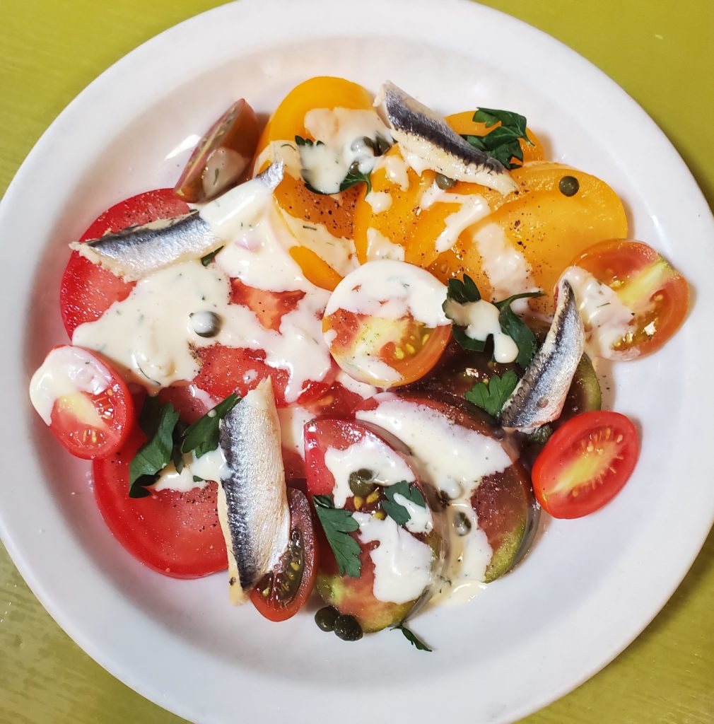 Stuff Special today at Café Presse Posted on July 12, 2020 By Jim Salad of heirloom tomatoes, capers, parsley, and vinegar cured anchovies, with a roasted shallot-dill vinaigrette. Tagged Anchovies, Cafe Presse, Capers, daily specials, Tomatoes