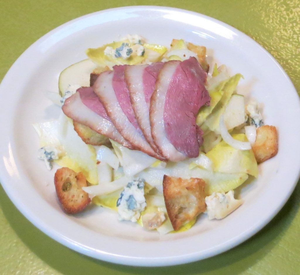 Stuff New to the menu for Fall at Café Presse Posted on September 25, 2020 By Jim Just added today to the menu at Cafe Presse: Salad of Belgian endive, Bosc pears, garlic croutons and creamy bleu cheese dressing. Choose the salad only (its vegetarian!) or opt to add slices of house smoked Muscovy duck breast. Miam Miam! Tagged Cafe Presse, Duck, Fall, Fromage, New Menu, salads