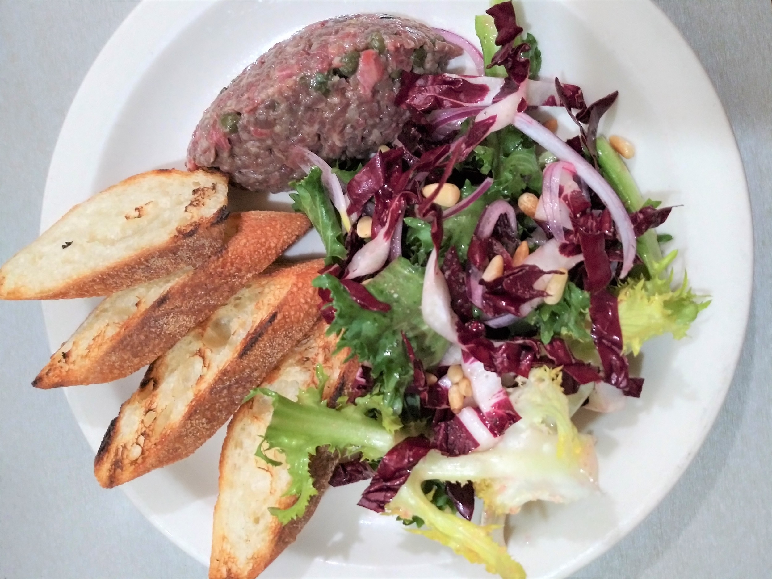 Served with a salad of curly and red chicories, red onion, pine nuts and a blood orange vinaigrette. Choose appetizer portions served with grilled baguette slices or main course portion with pommes frites.