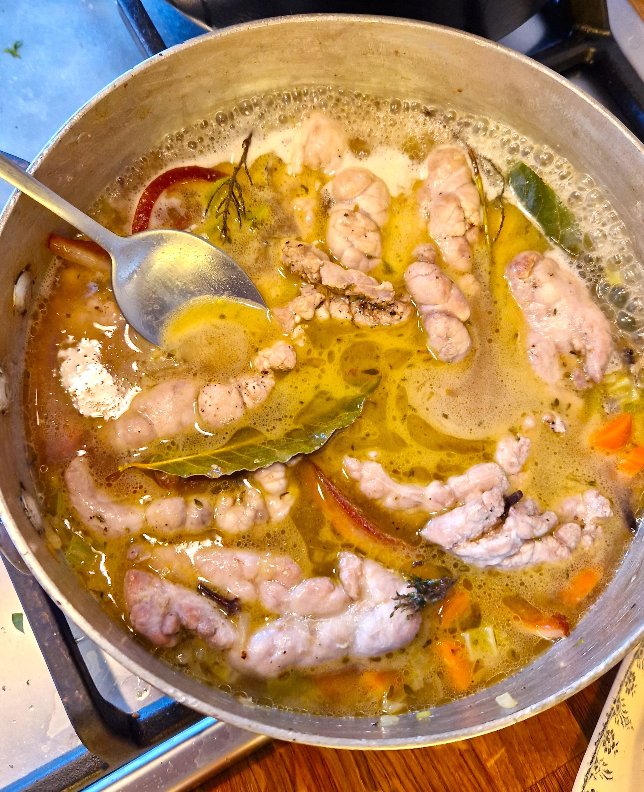 3) When the veggies have softened a bit without color, add the drained sweetbreads, a splash of white wine (I used a sweet Jurancon) and enough chicken stock to almost cover.