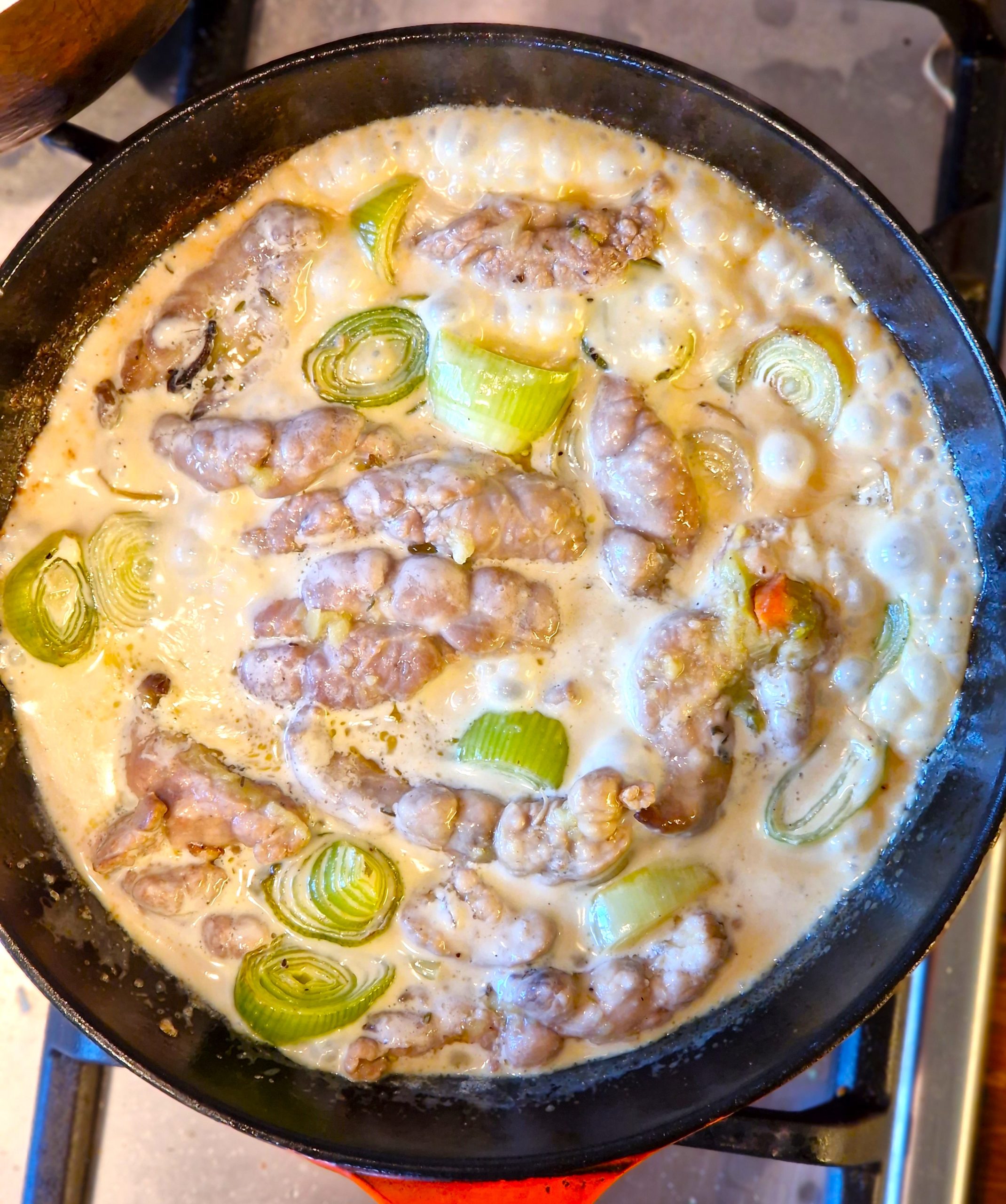 6) Saute slices of cleaned leeks in a butter in a heavy pan. Add the cooked sweetbreads and their cooking liquid, bring to a simmer and cook until the liquid is almost completely reduced. Add heavy cream and simmer to sauce consistency.