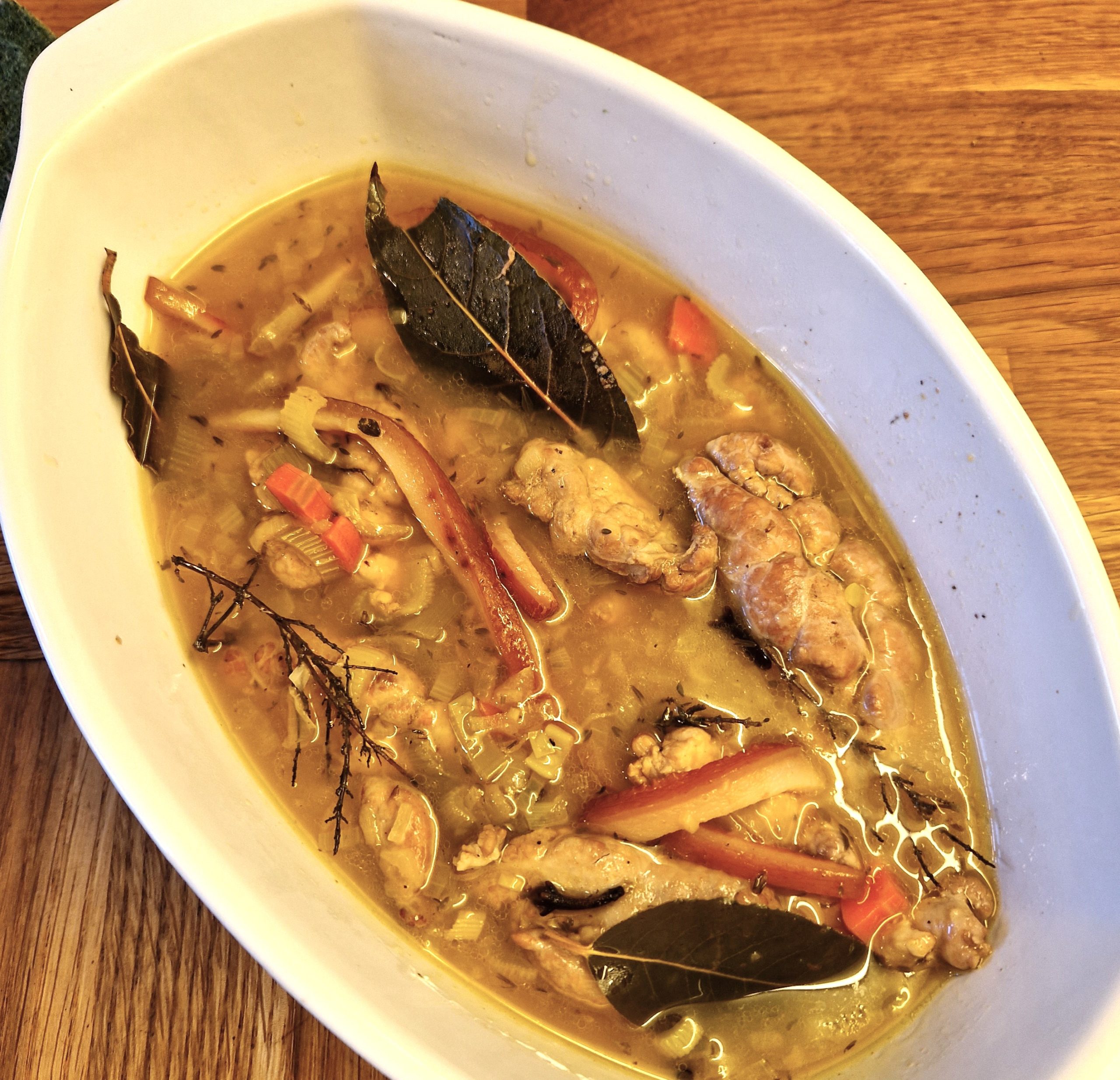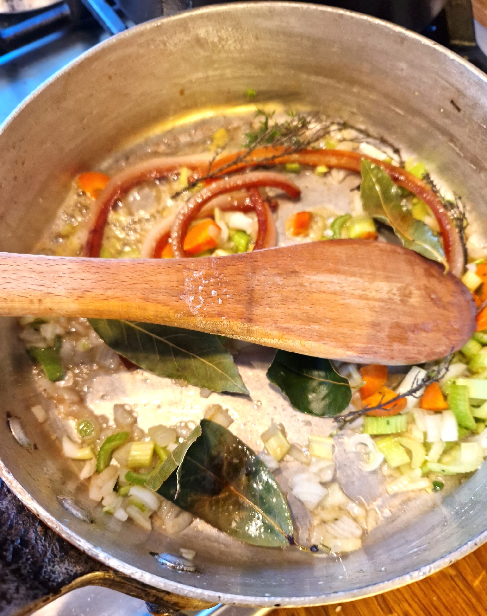 2) Gently saute chopped carrots, celery, leeks and garlic, add fresh bay, thyme, peppercorns and cloves. I also included the leftover rind from a couple slices of cured pork belly, but I would omit this instead of substituting with bacon as the smokey flavor will be too strong.