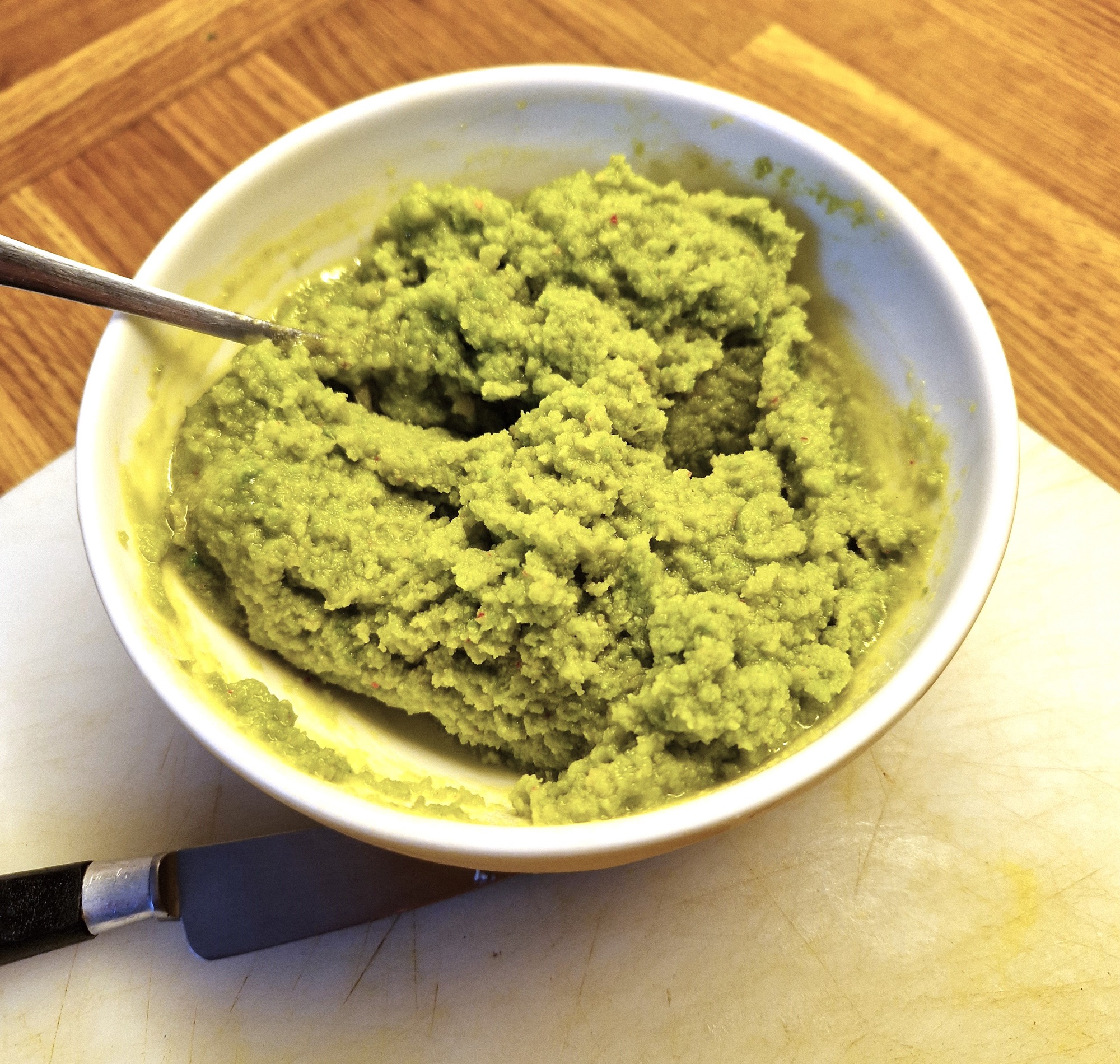 Still another way to enjoy fava beans during their (too short!) season. Thanks to my good friend Kelly Lillis for this recipe, which I first enjoyed at her home. This recipe works great for fava beans that have started to get starchy, save tender young favas for another use. The recipe is very quick and simple, if you don’t count the time to shell and peel the favas. This recipe is also a great way to make use of your lemon pickles if you have some to hand. Like chickpea hummus, the amount of lemon, garlic and olive oil you use will depend on your taste.