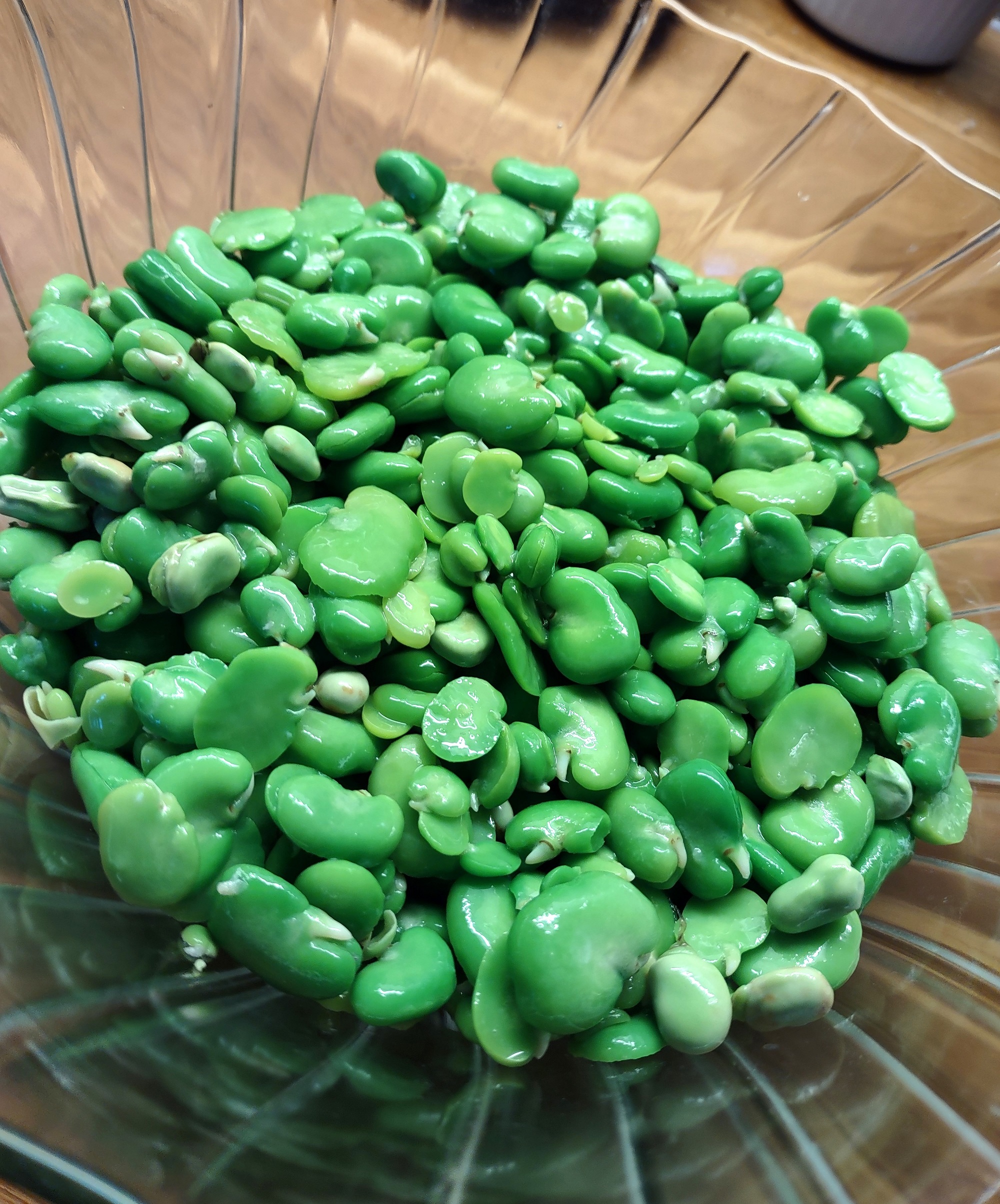 1) Shell the favas, then peel. To peel large favas, blanch in salted boiling water for about 1 minute, then shock in ice water. The outer skin should slip off easily.