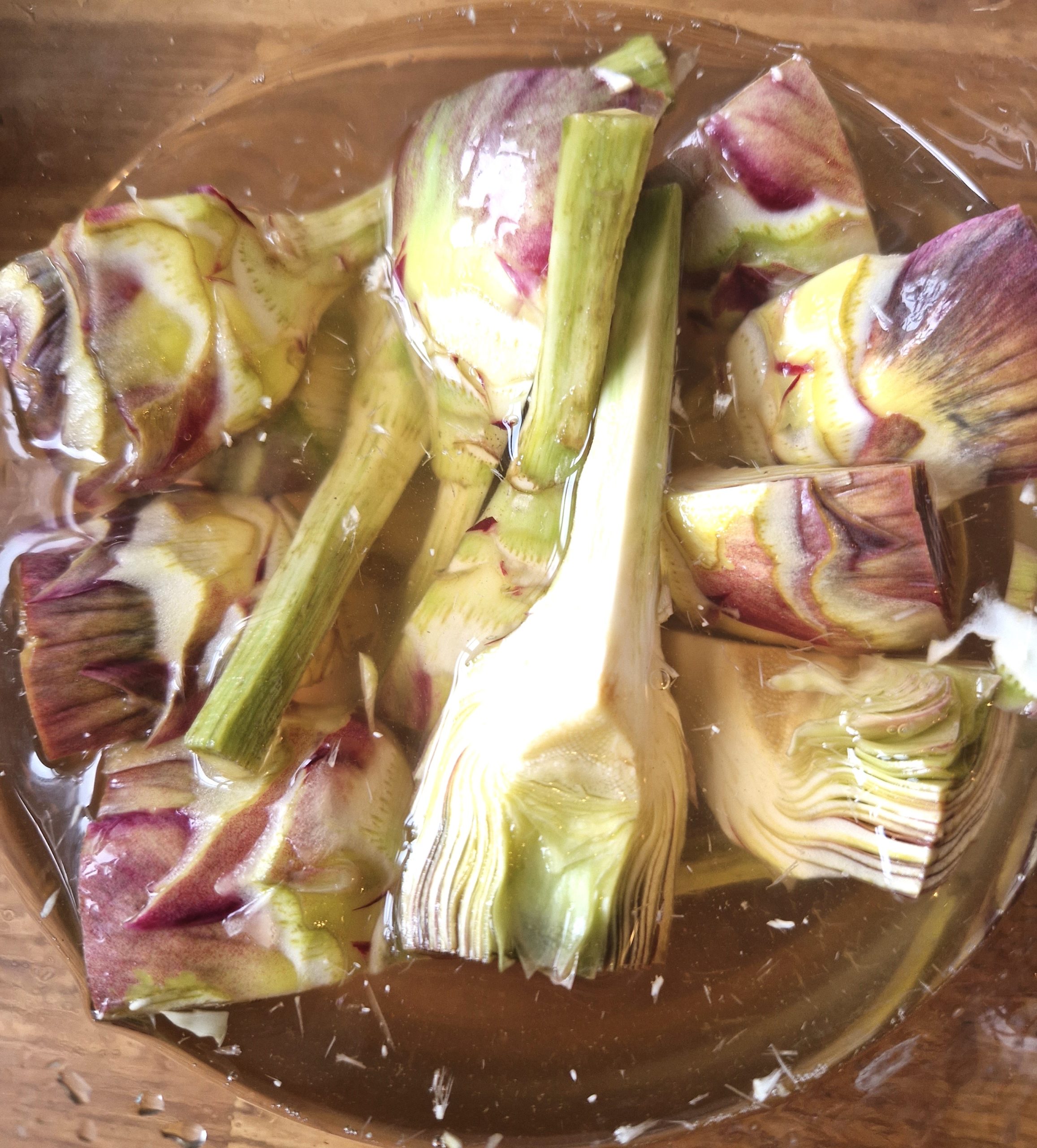 - Trim the artichokes, leaving only the inner, light green leaves. If the artichokes are small, it is not necessary to remove the inner choke. As the artichokes are trimmed, put them into water acidified with vinegar or lemon juice to keep them from browning.