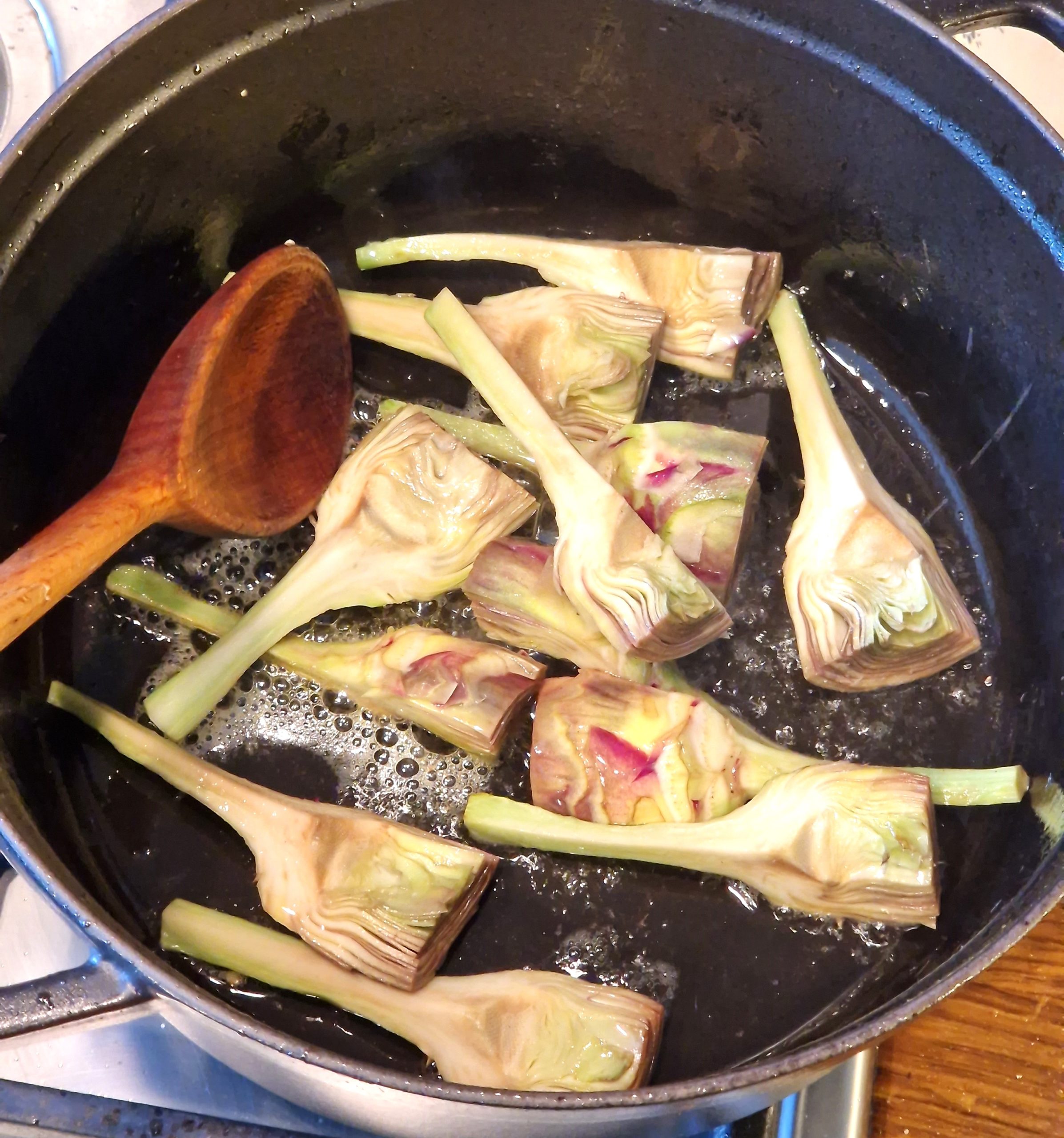 - In a heavy, lidded dutch oven, sear off the artichokes in a little vegetable oil and butter until they are nicely colored on all sides and starting to get tender in the stem. The leaves will still be tough. Season with salt and pepper, then remove and set aside.