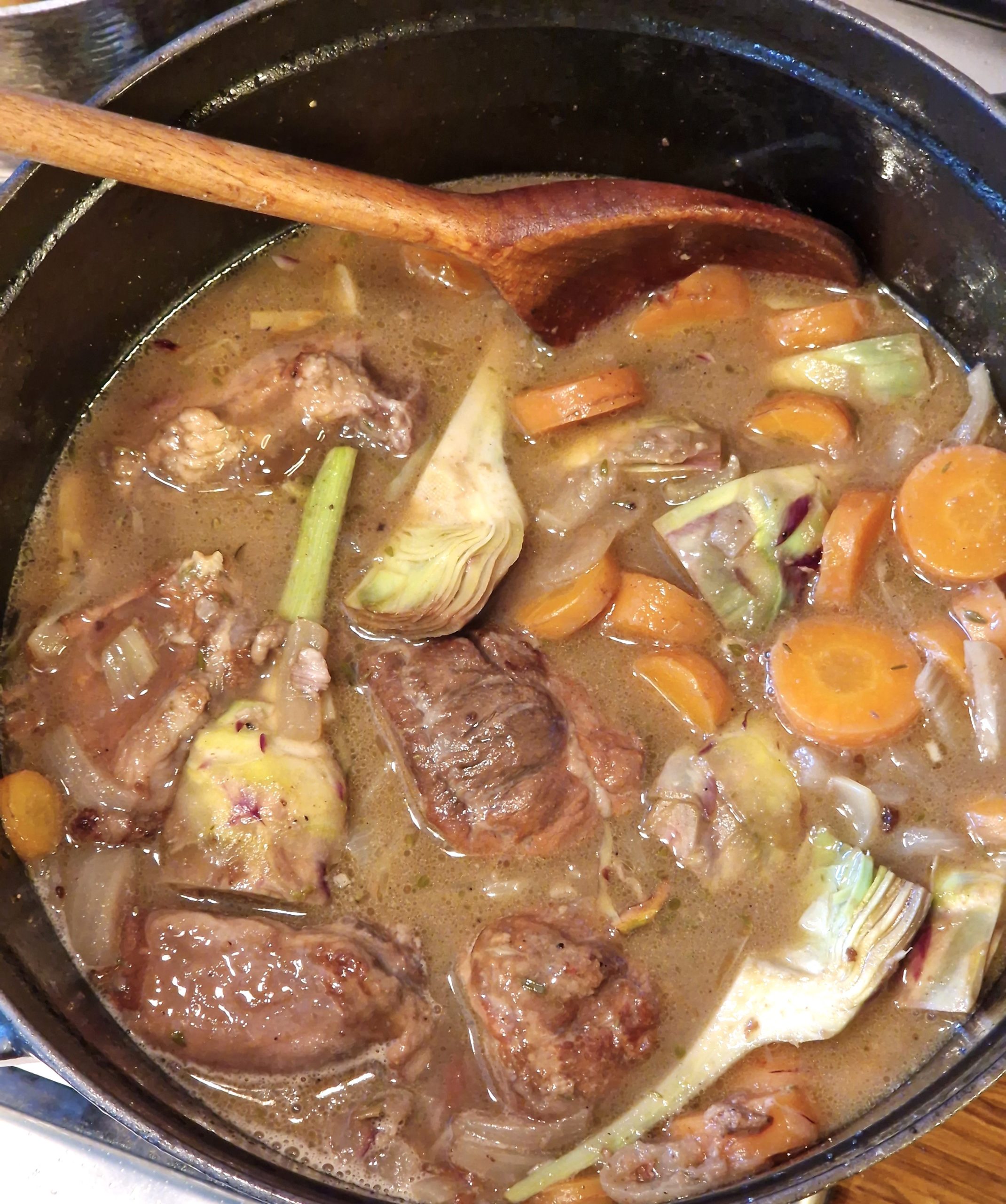 Tiny violet artichokes are one of the joys of late spring. The pale green new leaves are tender enough to eat whole, especially if slowly braised. Pairing them with rich, meaty pork cheeks simmered in Normandy apple cider, is a sure winner; the region of Normandy is known for pork, apples and artichokes so it is a natural pairing, This recipe is short on specifics because making a good stew doesn’t require specifics, you just follow your nose.