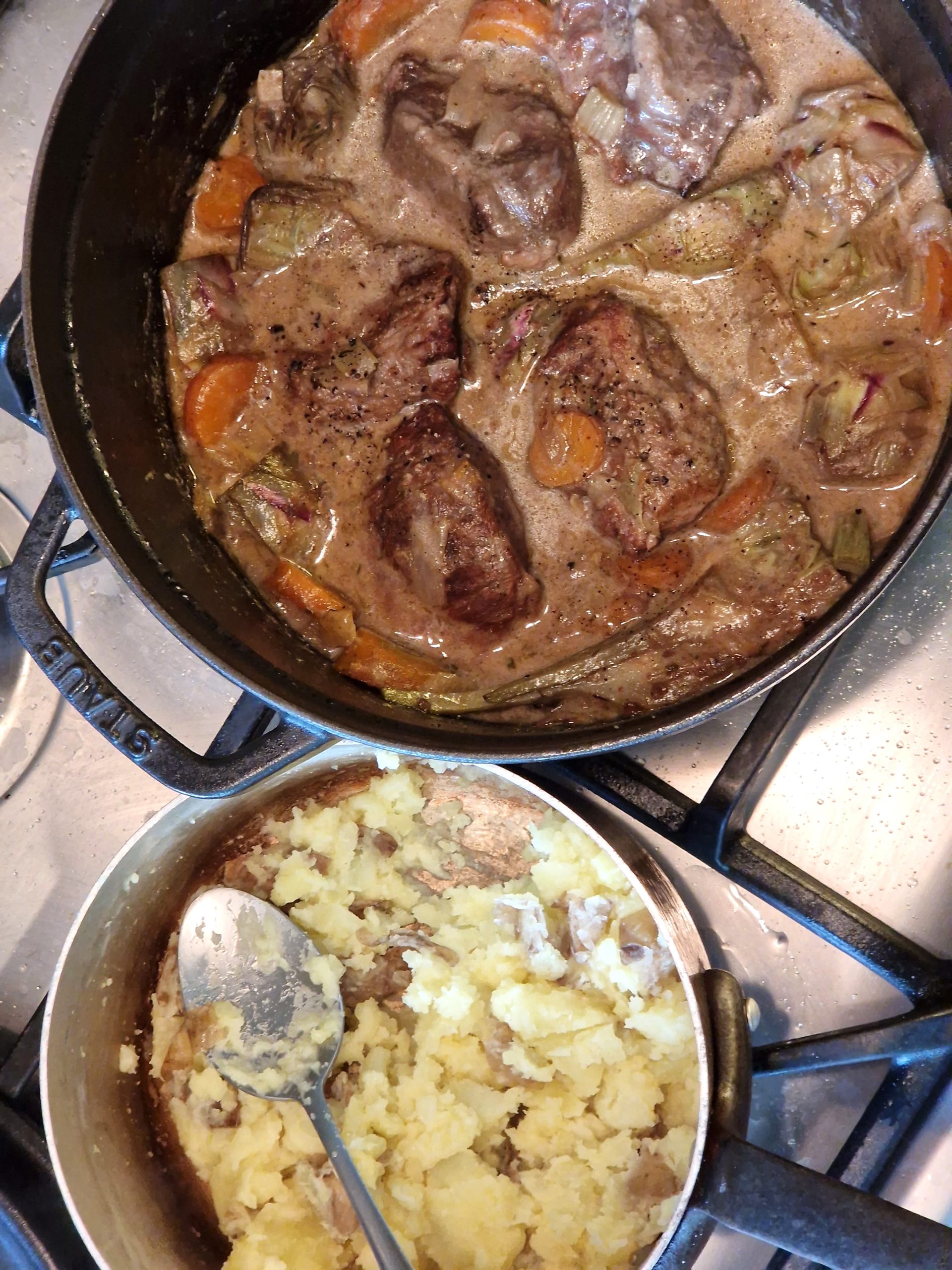 - Enjoy! I served this with rustic potato puree (basically boiled potatoes crushed with salt, pepper, cold butter and a splash of heavy cream) but buttered egg noodles would be great also.