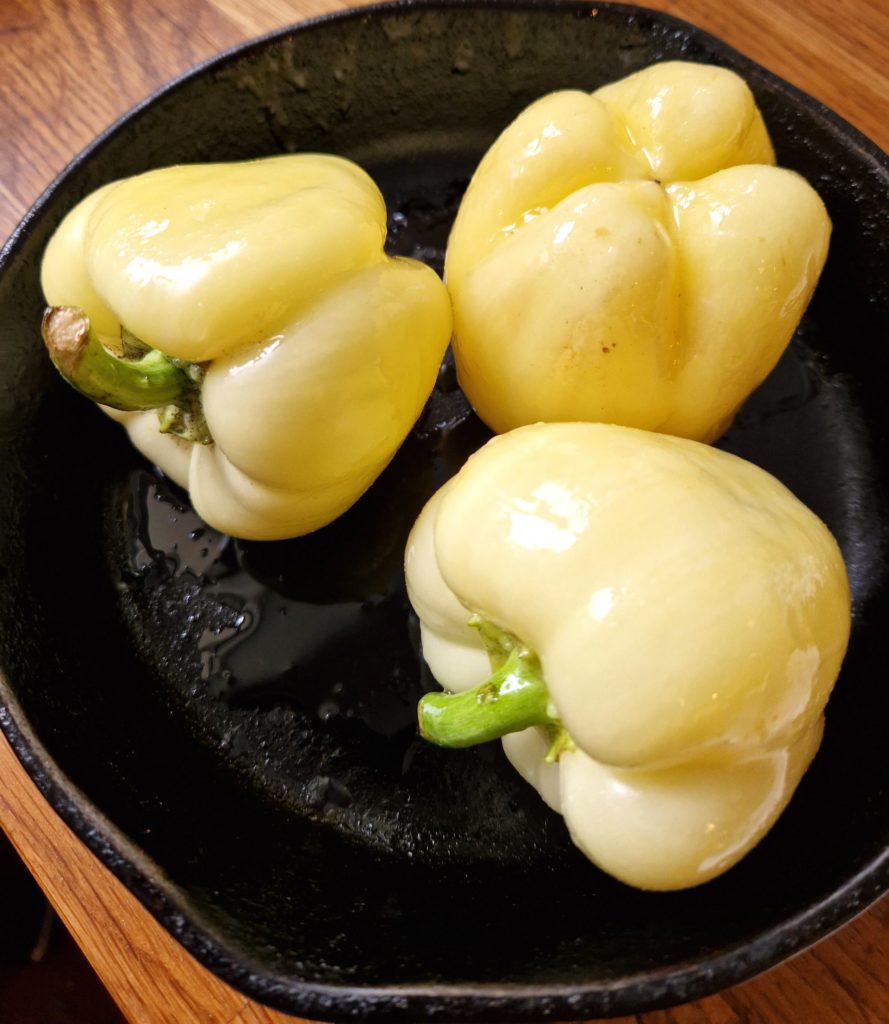 1) Roast the peppers: place them in a baking dish, drizzle with olive oil, season with salt and pepper, then place close to the hot broiler.