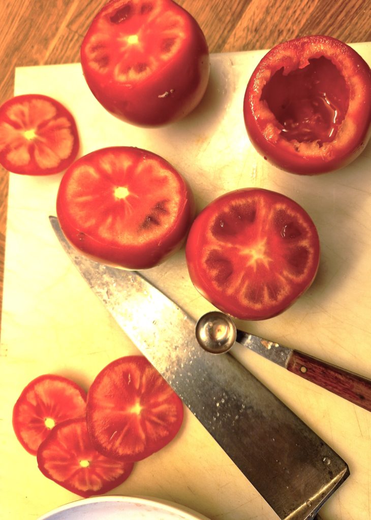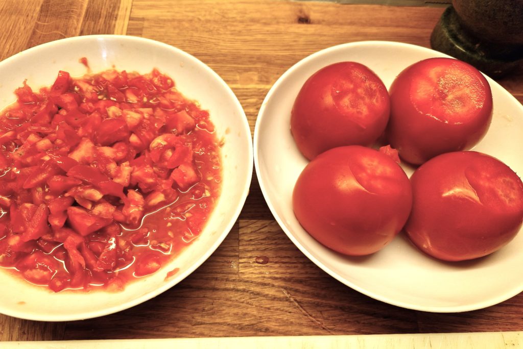 Chop the removed meat of the tomatoes and reserve for sauce with any juice that drains from the tomatoes. Note in the photo, I have removed a thin slice from the bottom of each tomato so that it be stable when stuffed.