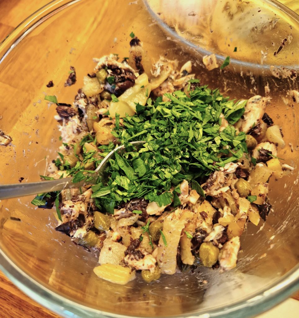 3) Finish the stuffing: Pick the parsley and chop. Mix the sardine meat, capers, preserved lemon, grated Parmesan and parsley. Season well with salt and pepper, add the chili flake to taste if using.