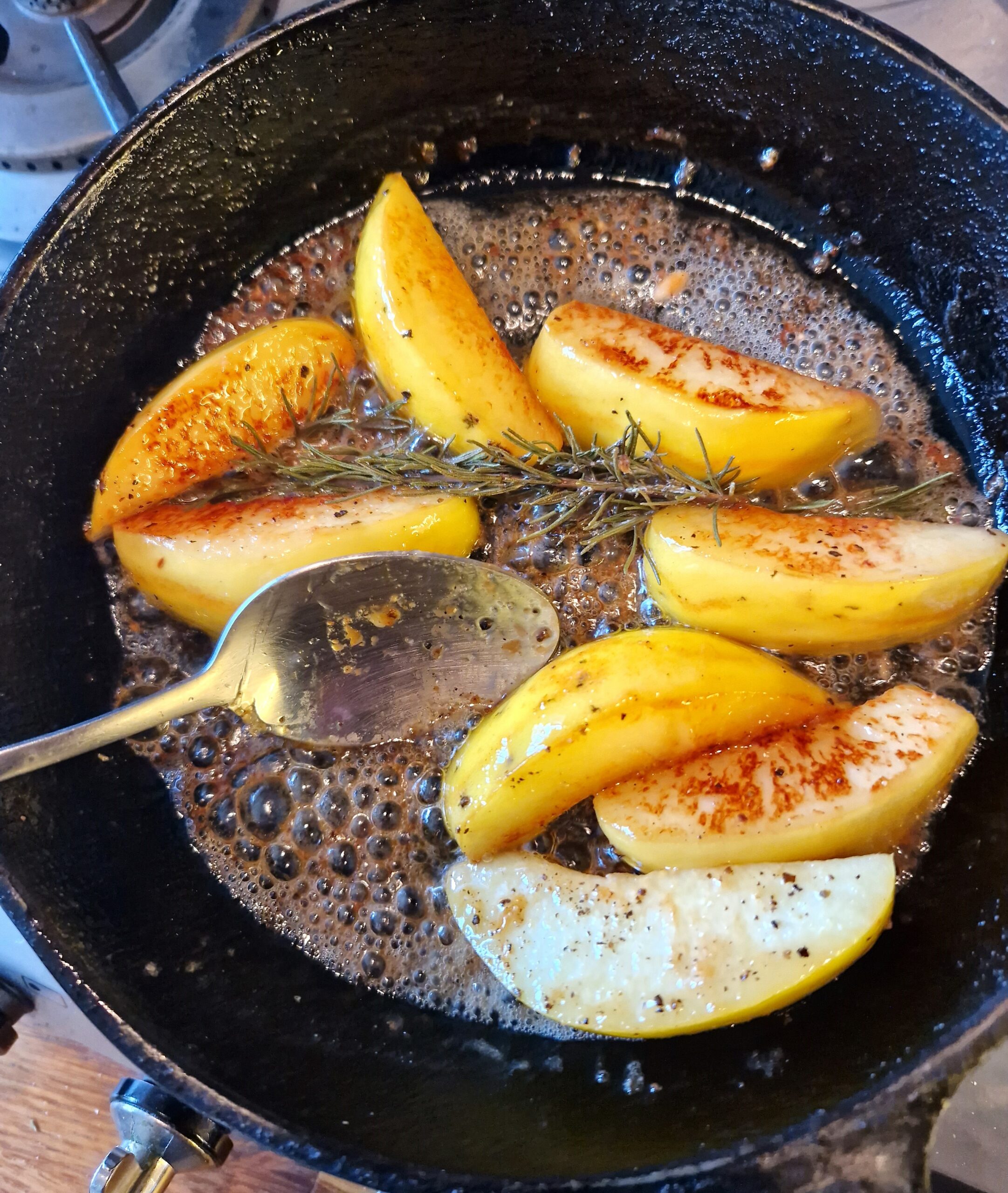 4. Melt a nice knob of butter in a saute pan. Add the quince wedges, season with salt and pepper, drizzle with a tablespoon of honey, toss well. Add the rosemary sprigs to the pan, then move to a hot oven. Continue cooking, tossing often, until the quince pieces are just tender but not mushy.