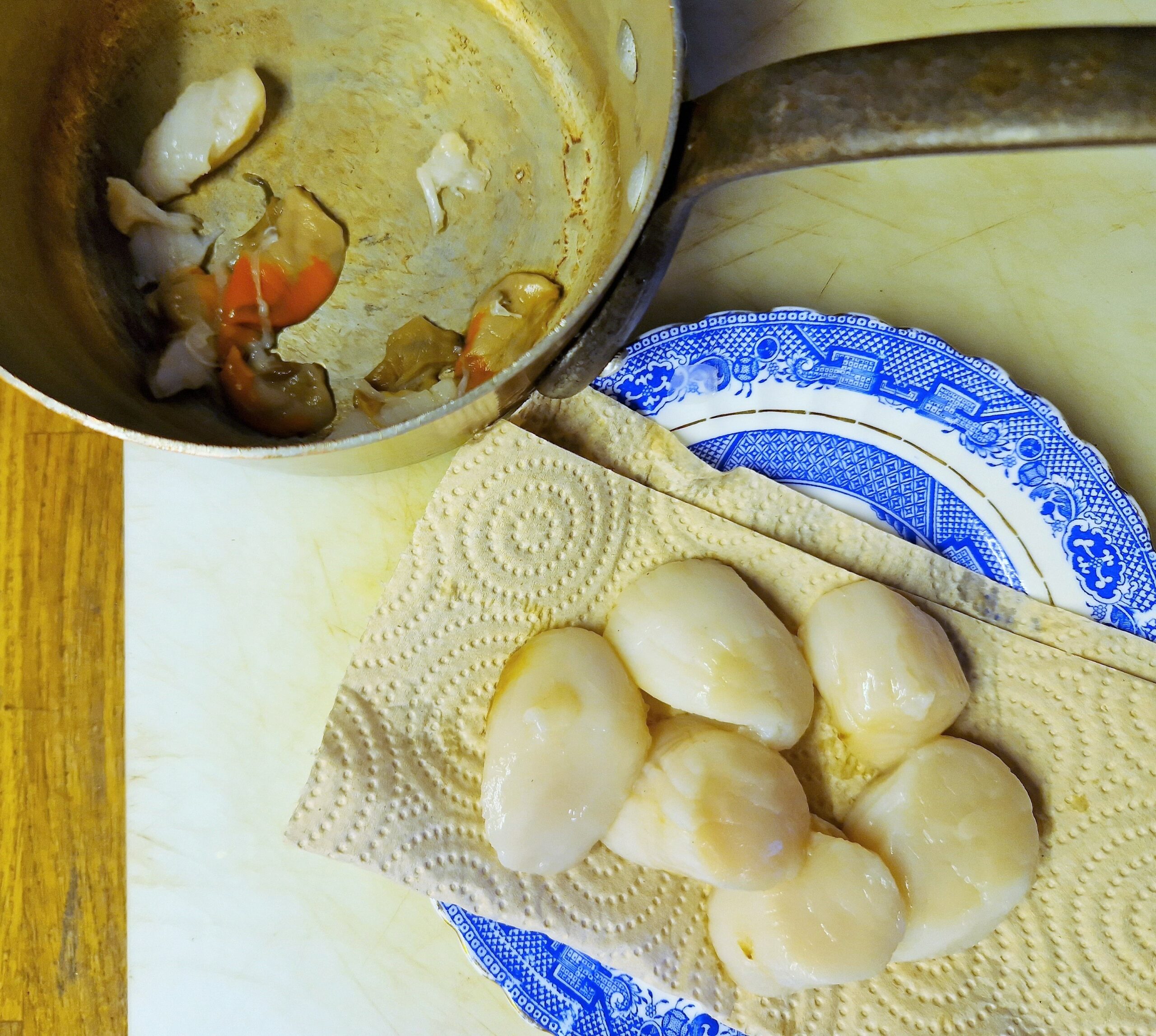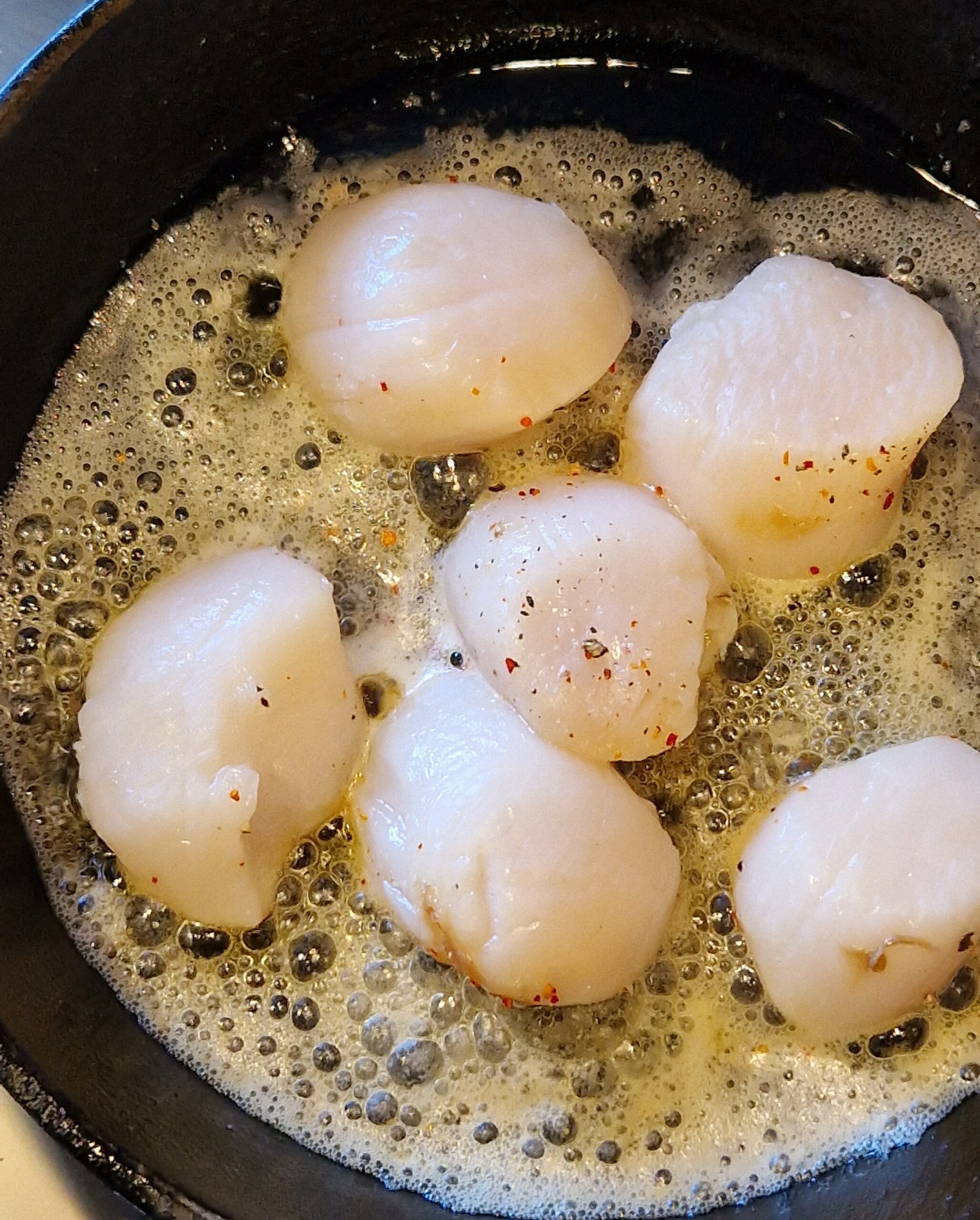 - 6 large fresh Normandy sea scallops, with roe and connective nerve