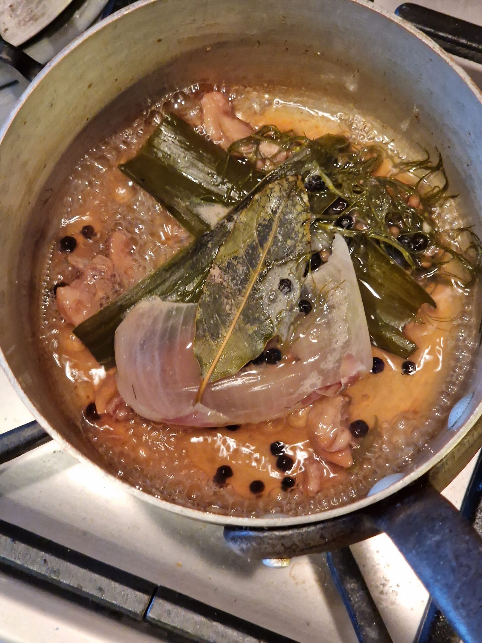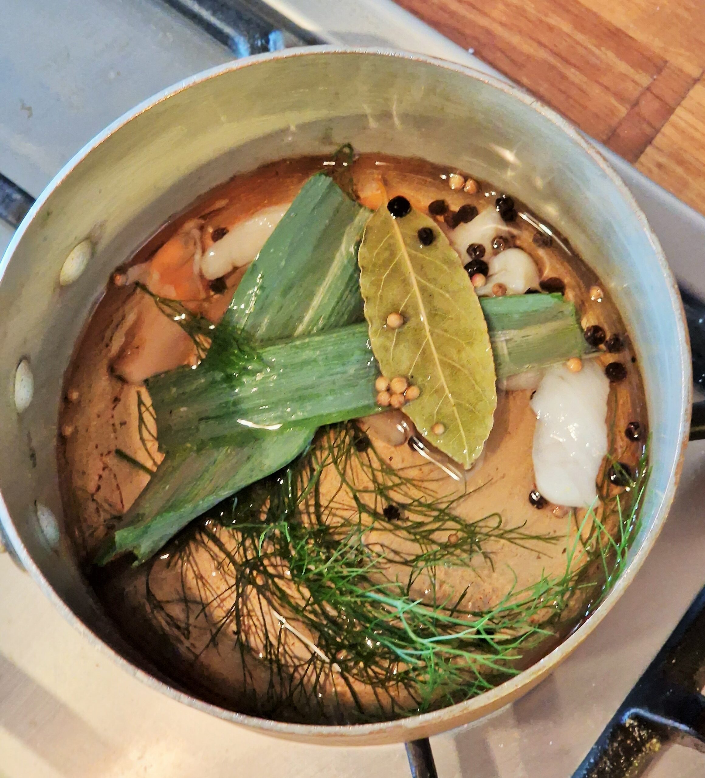 - To the saucepan, add the white wine, bay leaf, coriander, fennel frond and black peppercorns. Bring to a boil, then reduce over high heat until only about 2 T liquid remains. Set aside.