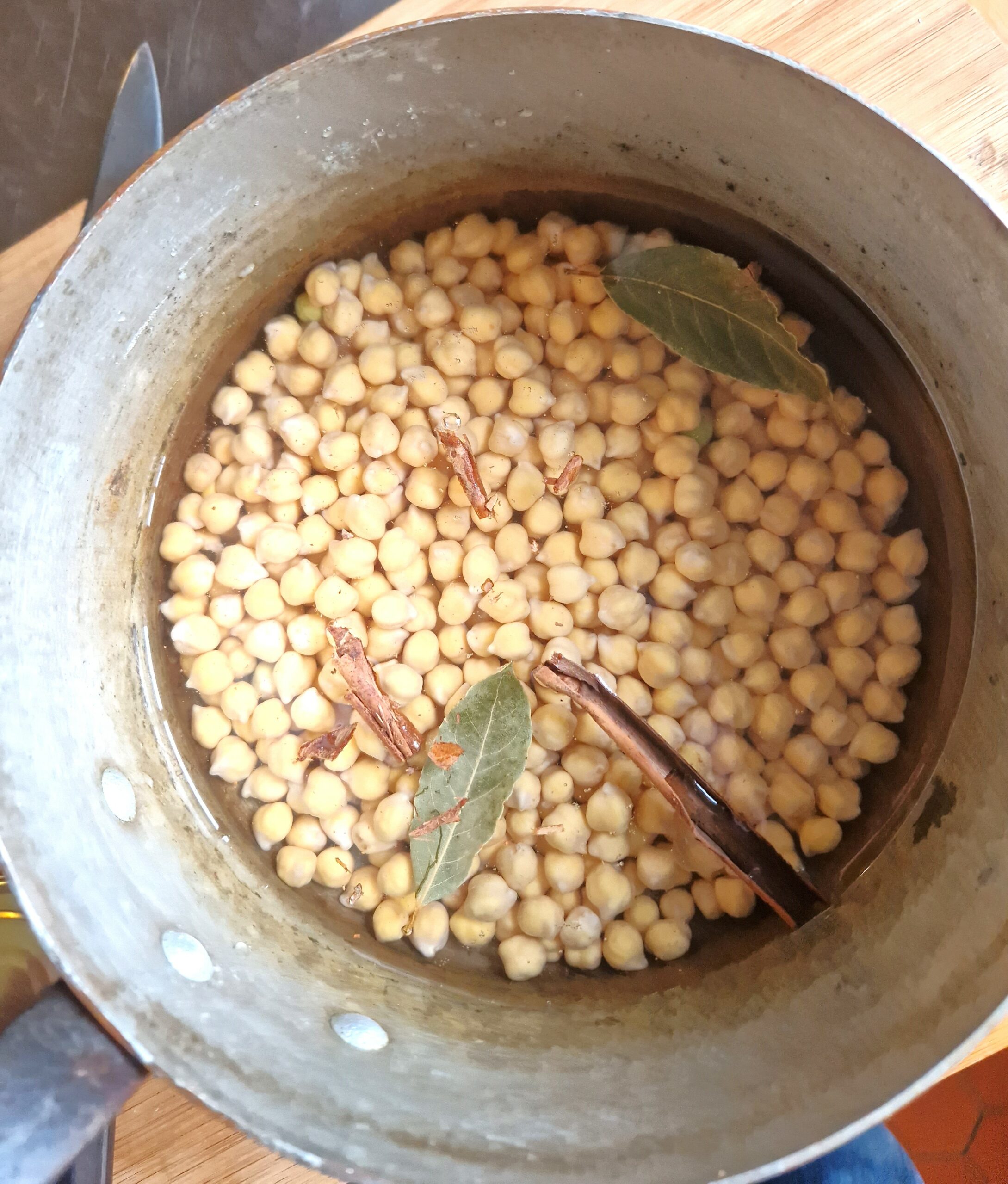 1) If you are cooking the chickpeas from dry, soak in a lot of water overnight. Drain, add new water to cover by about 1/2 inch, add a bay leaf, cinnamon stick and a clove of garlic. Bring to a boil, reduce the heat to very low, cover and continue to cook until the chickpeas are very soft. Cool in their cooking liquid.