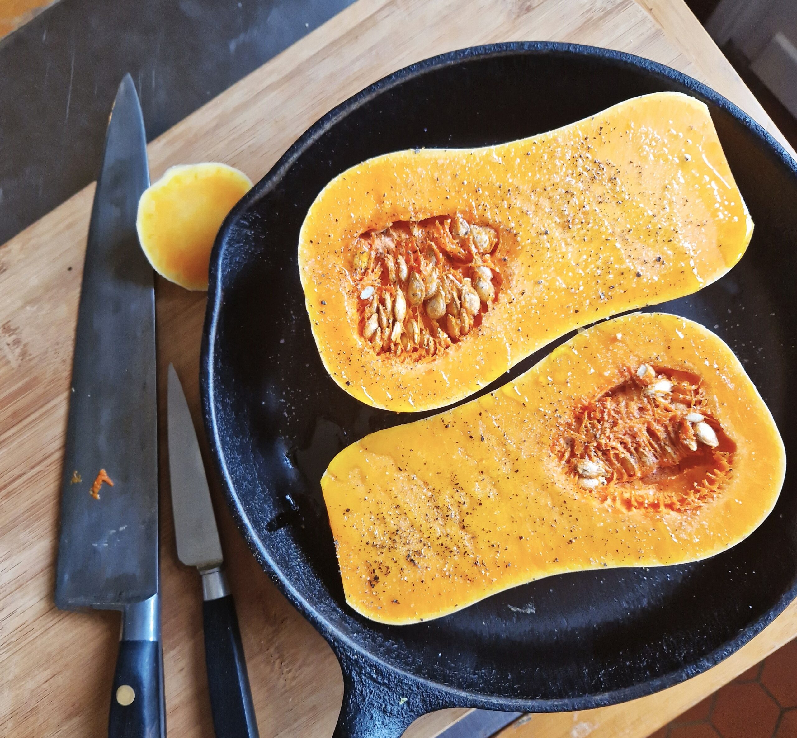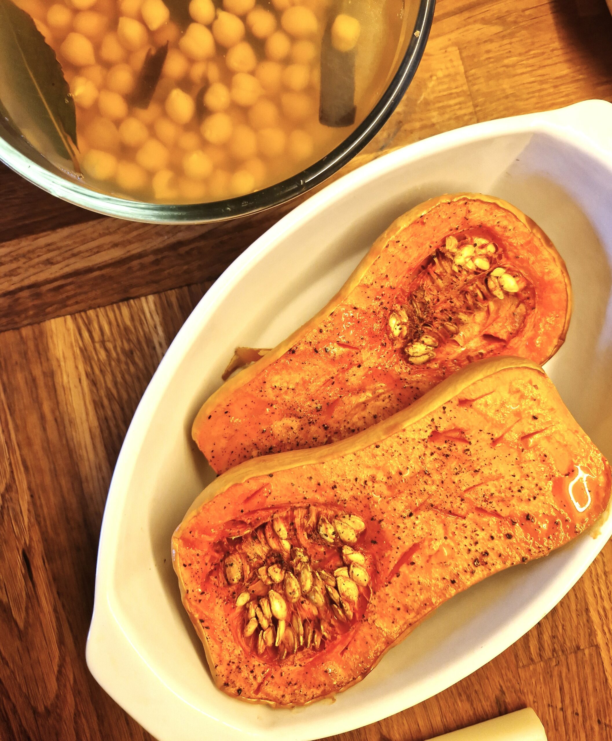 2. Cut the butternut in half the long way, put in a baking dish cut sides up. Drizzle with olive oil, season with salt and black pepper. Roast in a 350 degree oven until very tender. When tender, scoop out the seeds with a spoon. Use your fingers to remove the peel. Measure out the amount of squash needed, save the rest for another use.