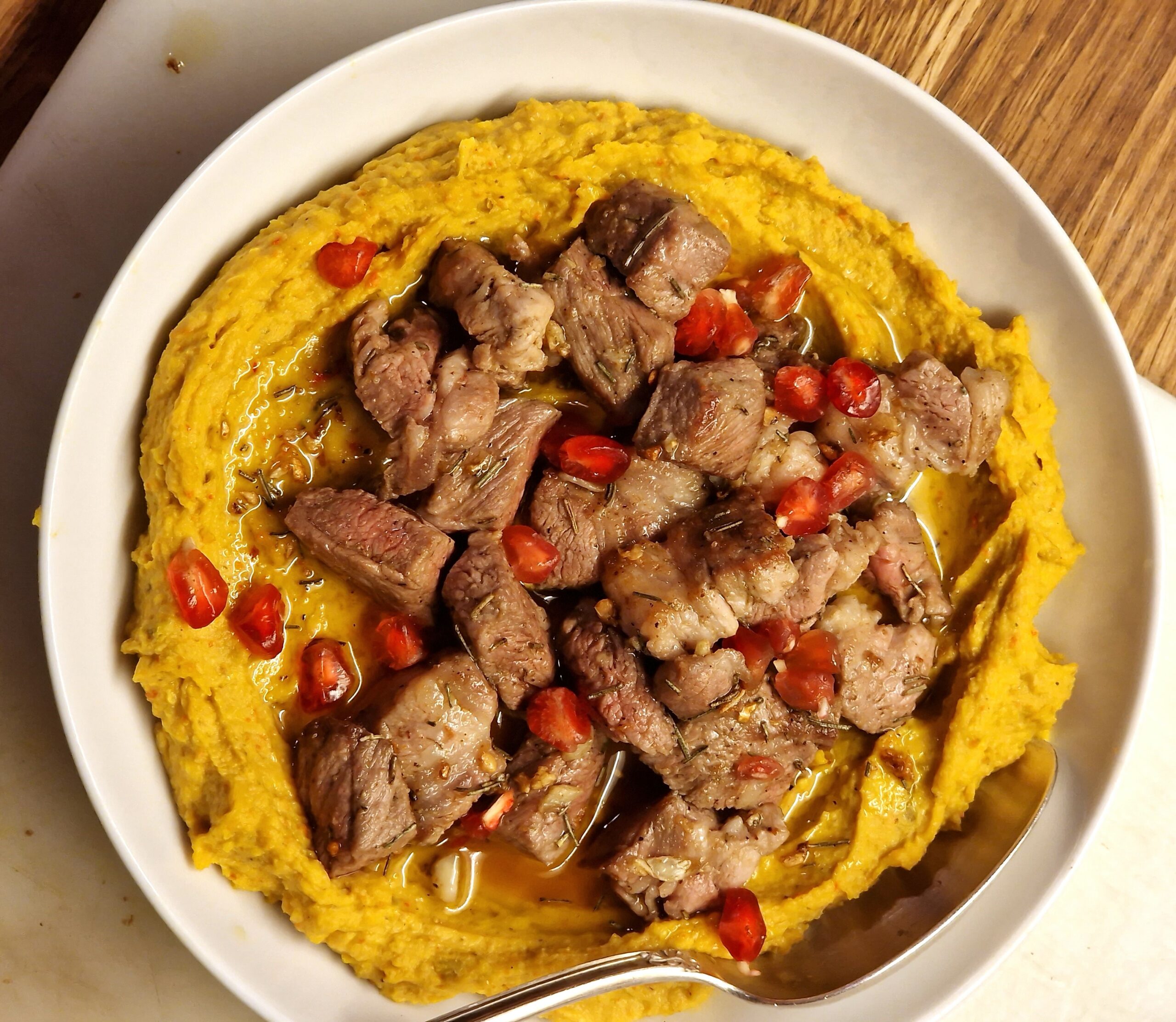 For the tasting, I offered this hummus canape-style, on toasted bread with pomegranate seeds and toasted walnuts. But we like to make it the center of a meal by topping it with marinated lamb cubes sauteed in olive oil.