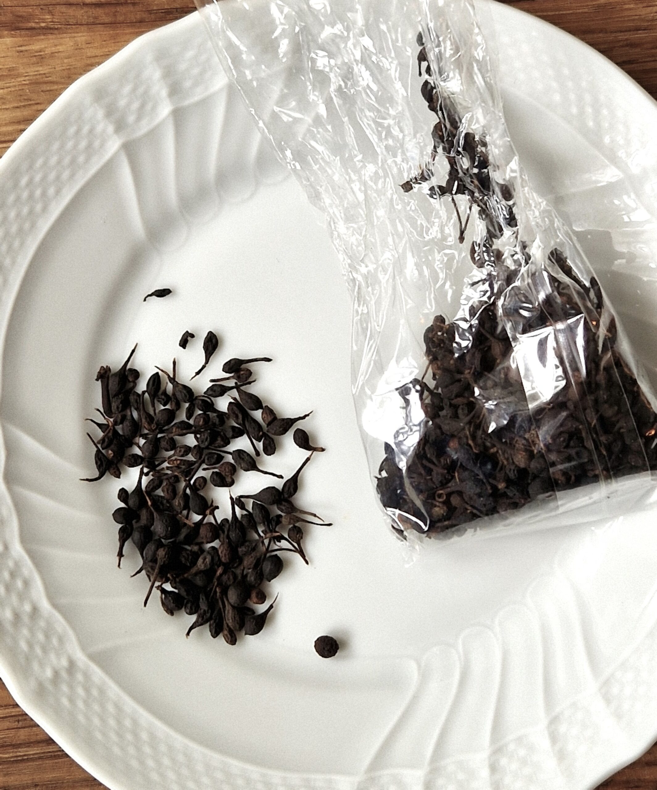 Visually, the main difference between regular wild black pepper is that each wild pepper berry has a little tail, a tiny piece of its stem that remains attached after it is gathered.