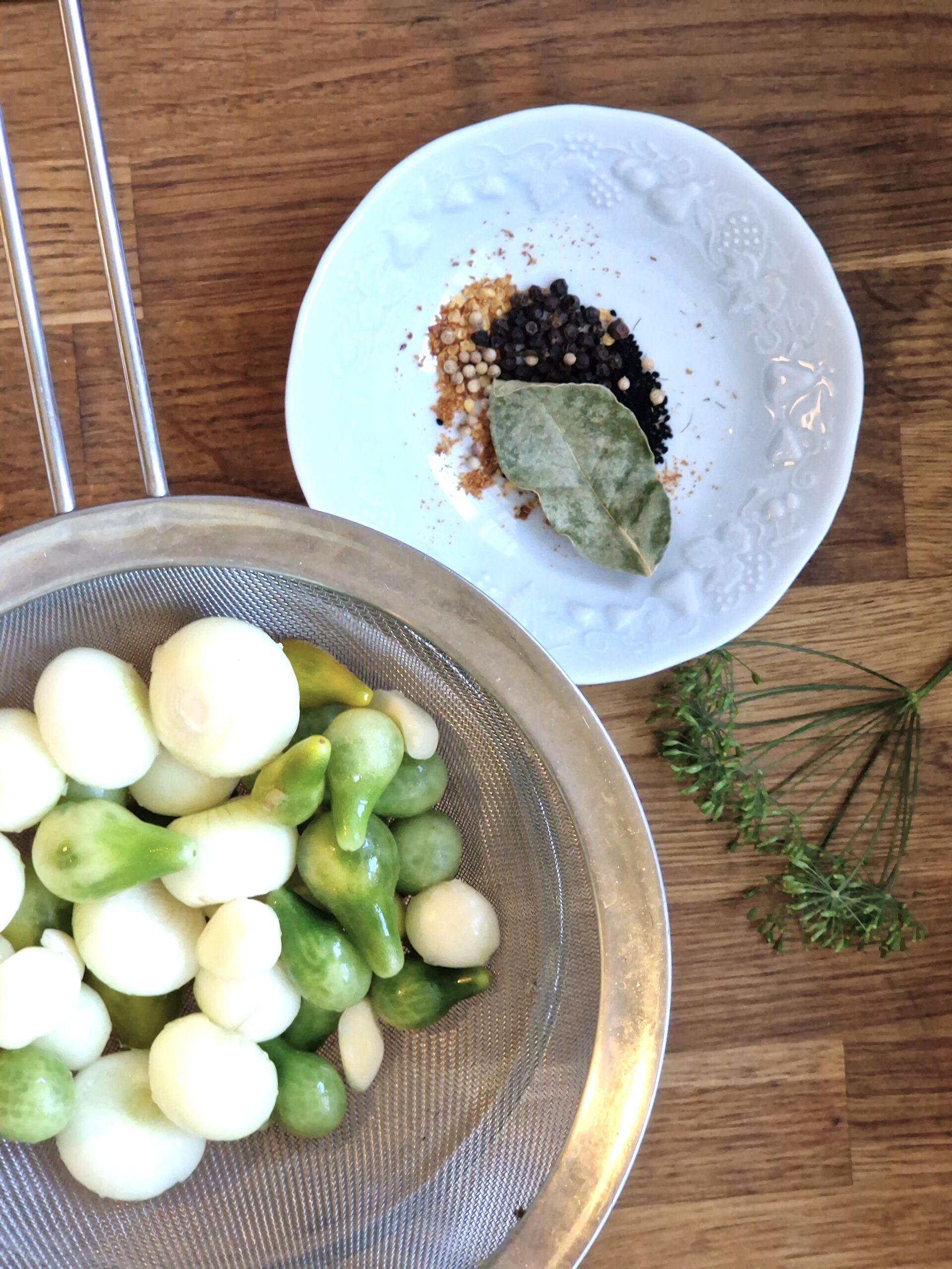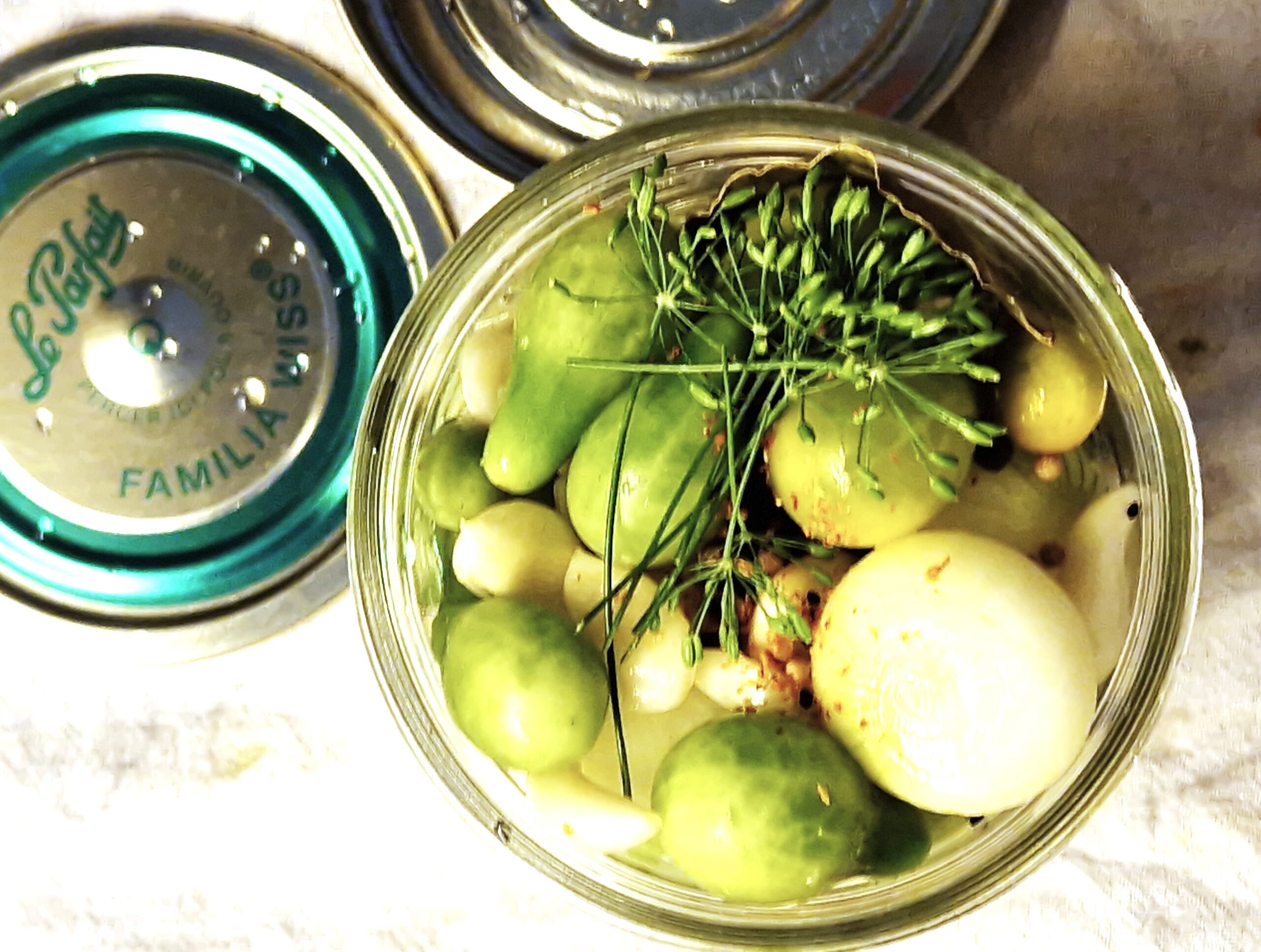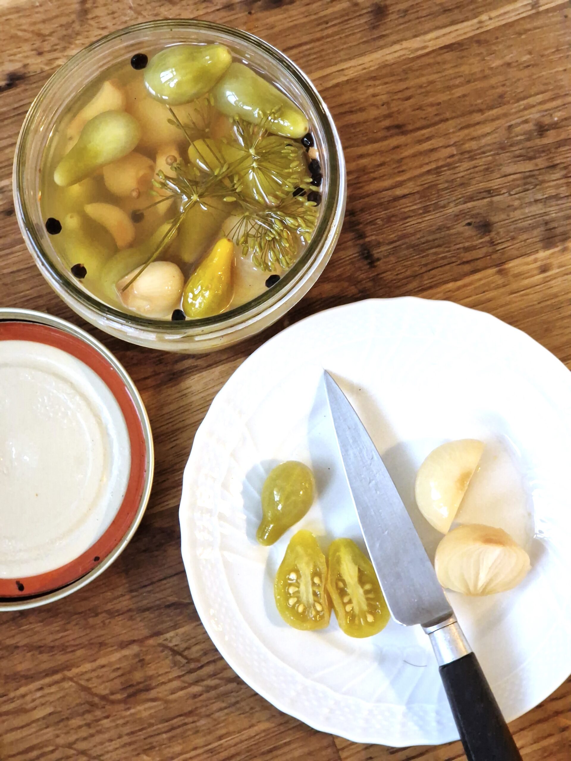 I tasted my green cherry tomato-pearl onion pickles recently and I think they turned out very well. So I am passing on the recipe. Note that this same method could be used for many veggies, such as green beans, cabbage and cauliflower.