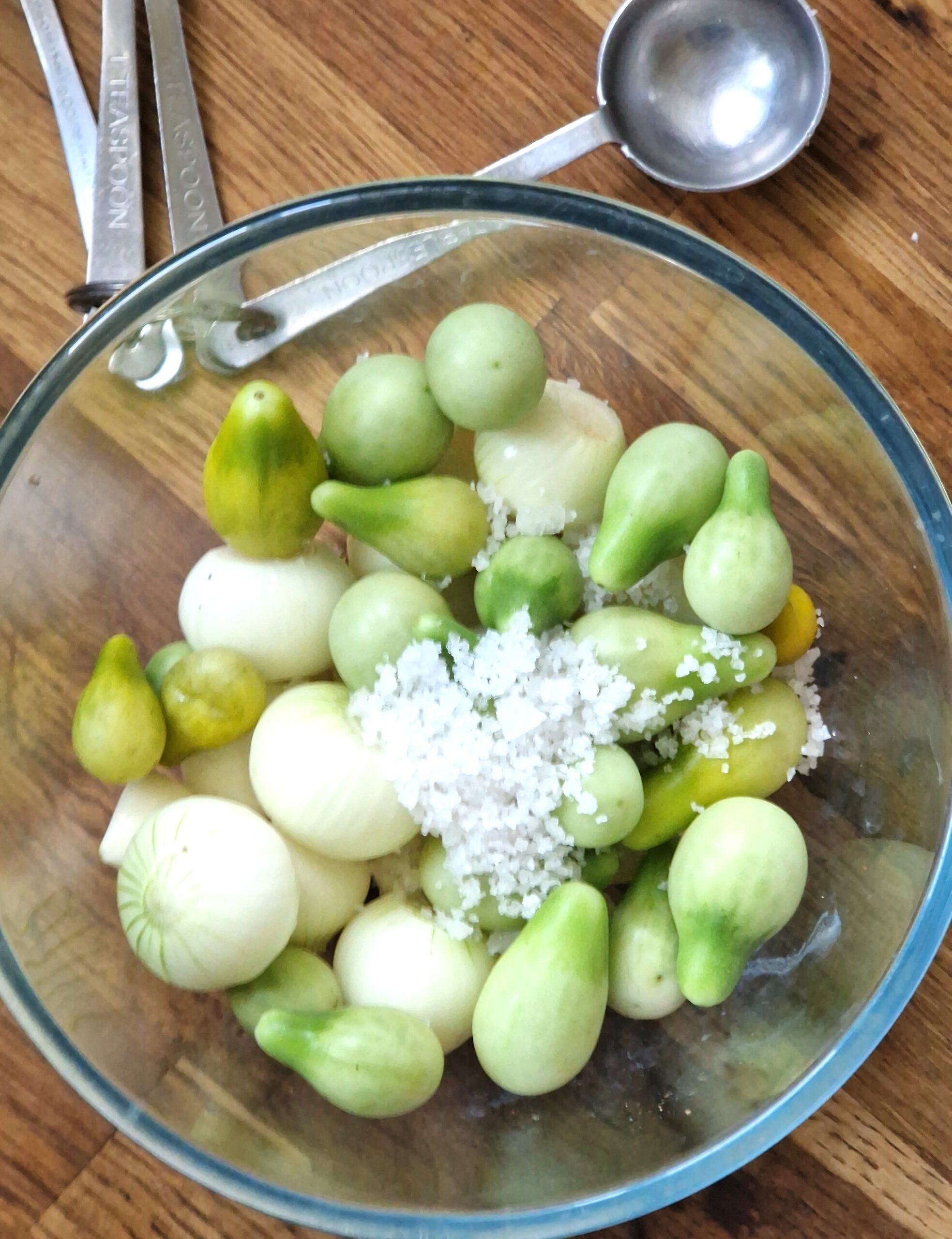 - Peel the garlic and onions. Wash the green tomatoes. Mix the salt and a couple tablespoons of warm water, then toss with the tomatoes, garlic and onions in a glass bowl. Cover and leave overnight in refrigerator.