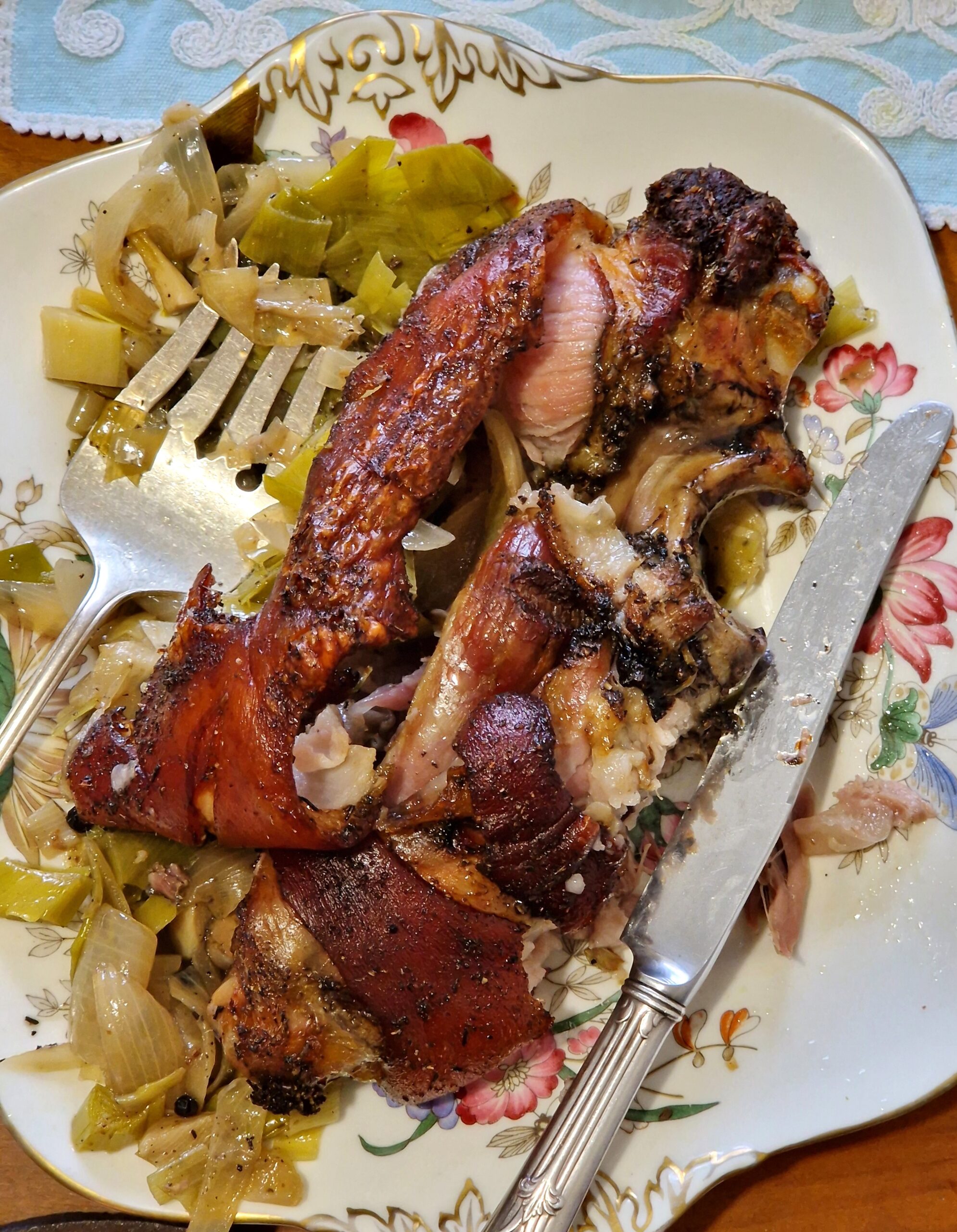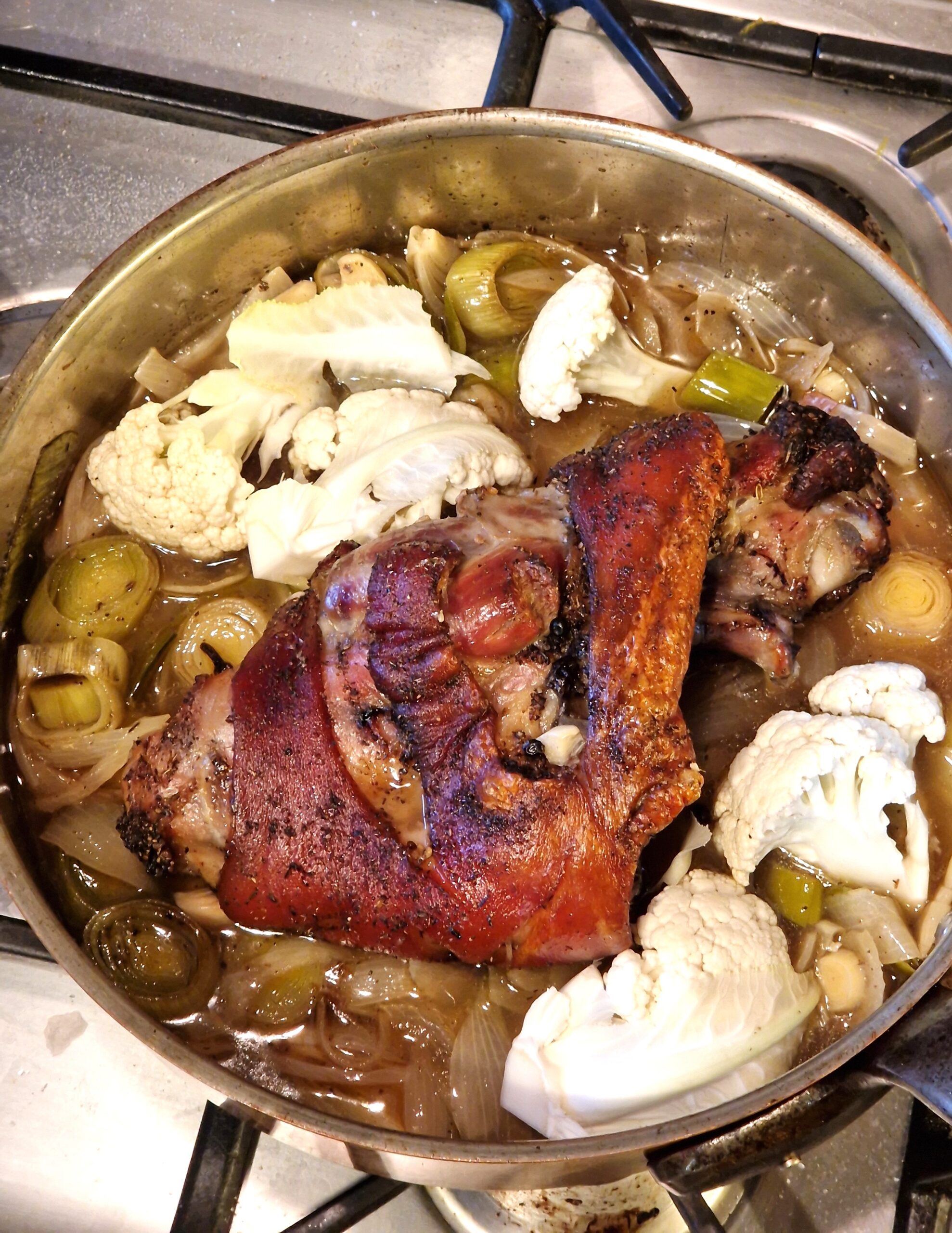 - Move the whole shank to a serving platter, surround with the leeks and cauliflower, keep warm while finishing the sauce.