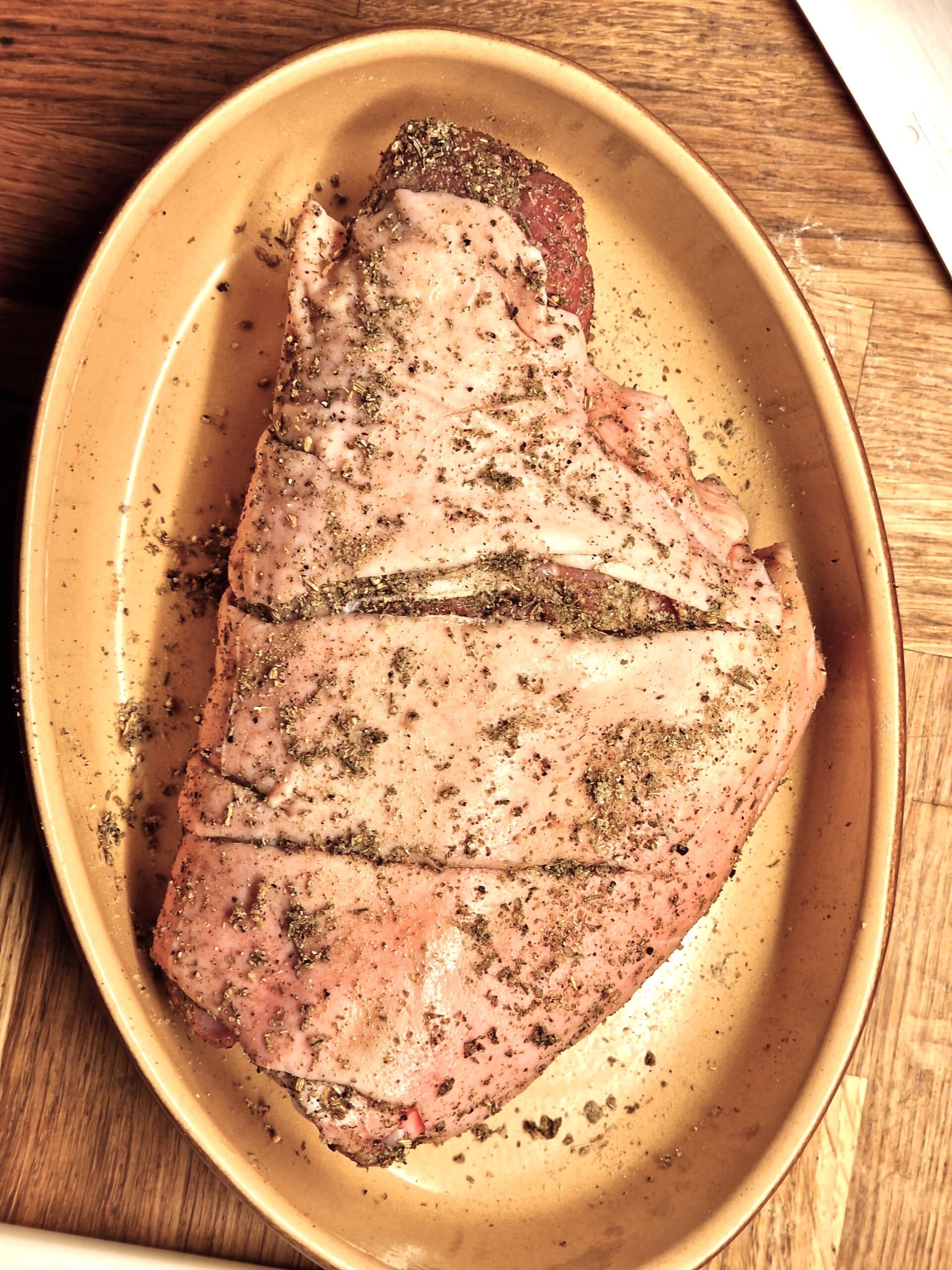 - Score the skin of the shank in several places to allow the fat to drain out during cooking. Rub the shank all over with the spice mix, especially on the skin. Leave uncovered in the refrigerator 24 hours.
