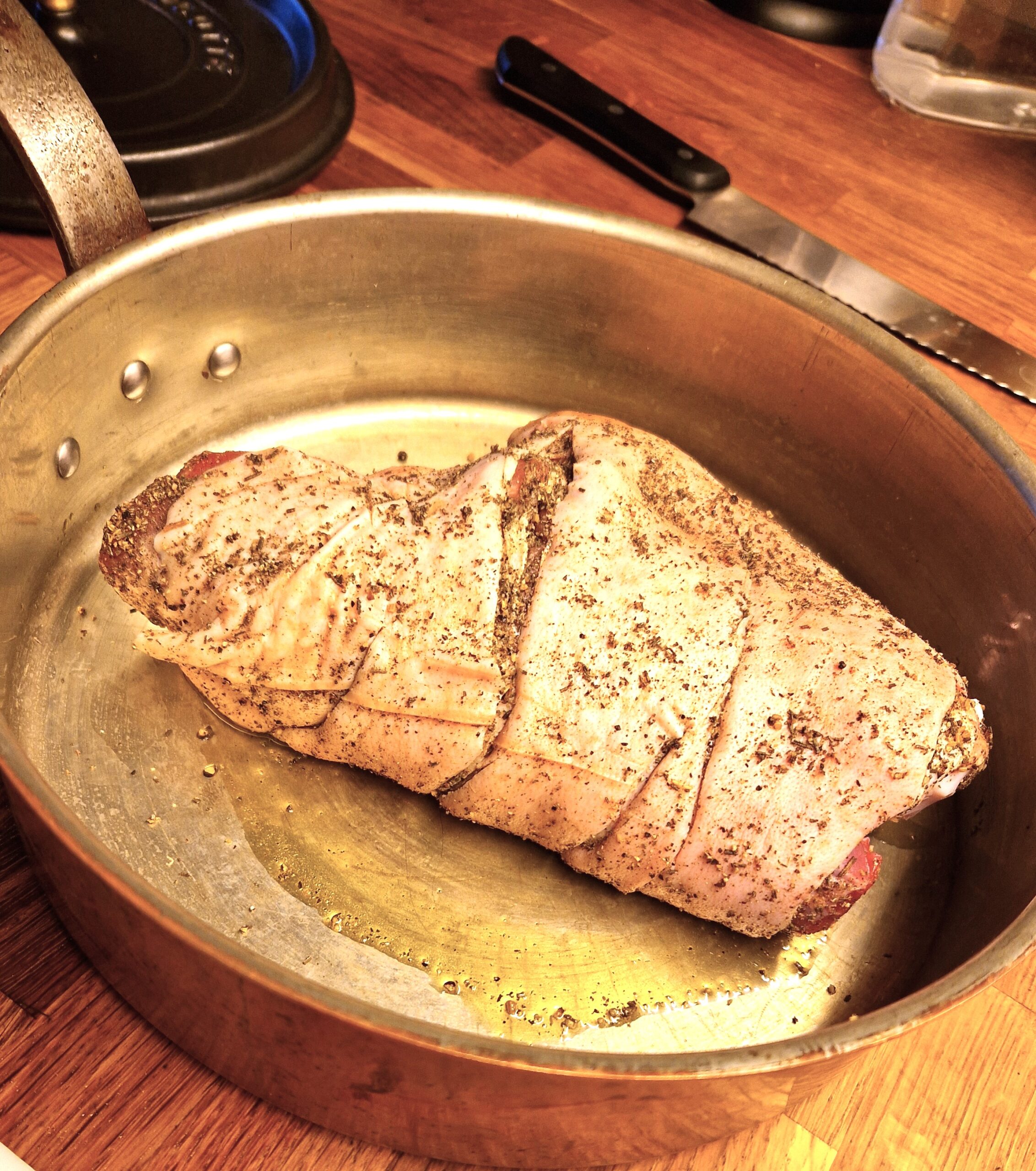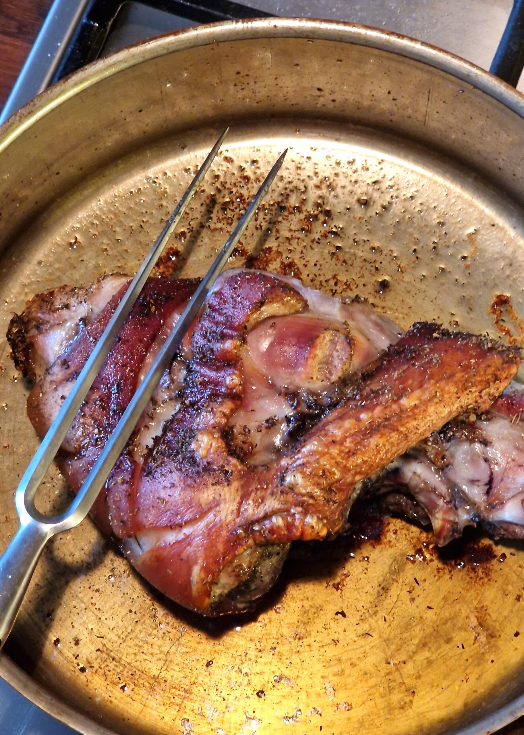 I was recently in Segovia, Spain, where we enjoyed the local specialty, roasted suckling pig…crackling, mahogany colored skin on the outside and meltingly tender meat on the inside. Yum! However, getting hold of a sucking pig is not the easiest thing for most people. So instead, here is a recipe for roast whole pork shank that give the same crisply/tender feedback. The trick to getting the skin crispy is 1) make sure that you ask your butcher for skin-on shank, as otherwise it will almost surely be removed 2) rubbing the skin with a salt rub at least 24 hours before roasting dries out the skin, making it easier to crisp up 3) roast the shank first in a very hot oven for about 45 minutes, then lower the temperature and let the shank cook until crispy and tender.
