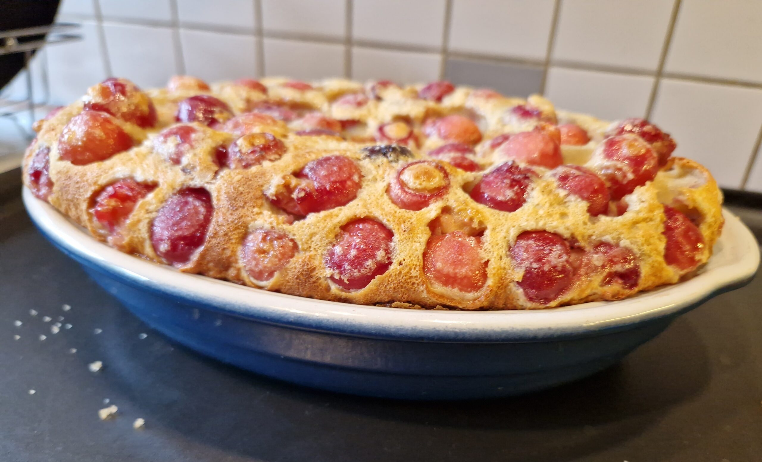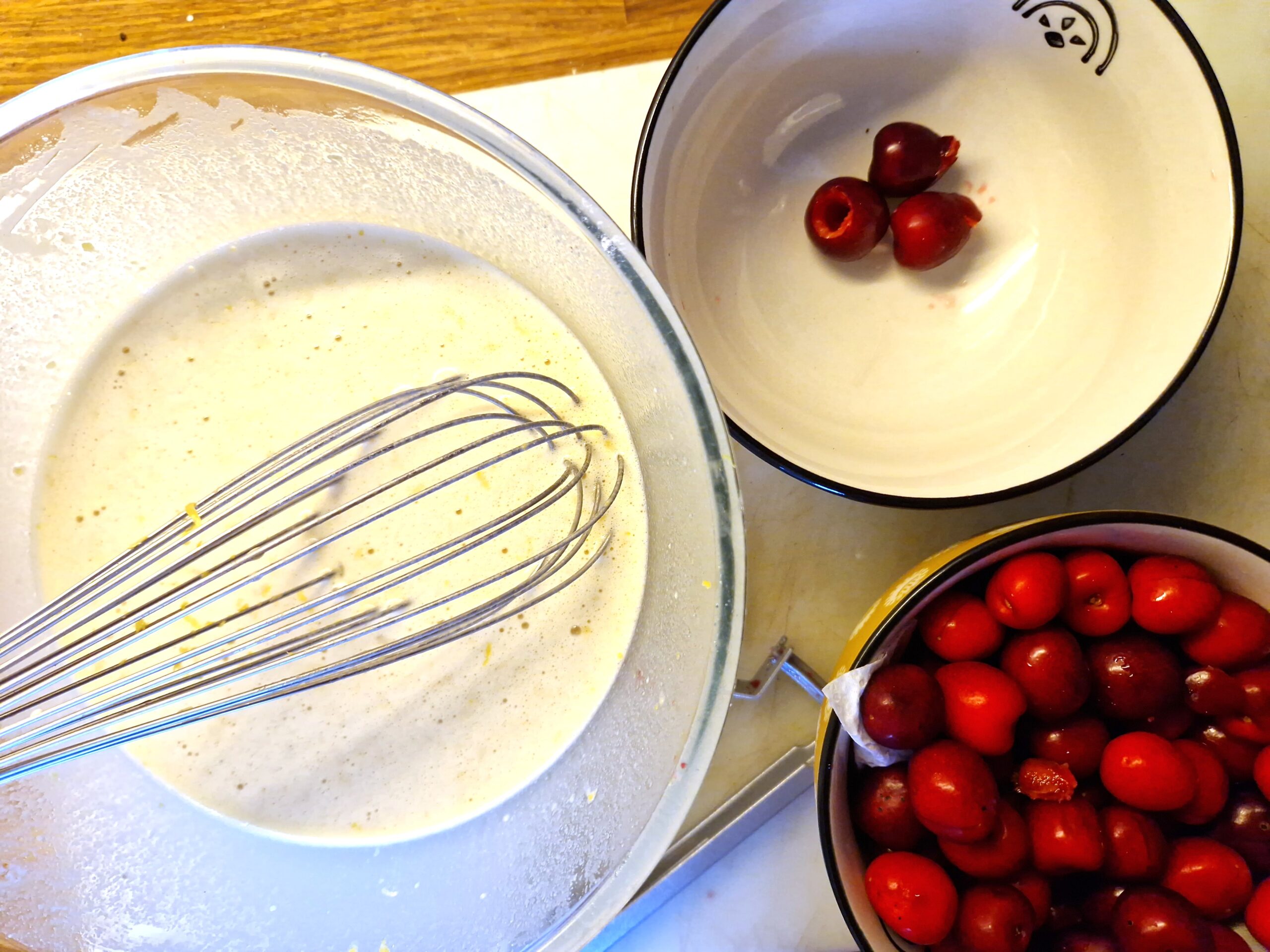 The question of whether or not to pit the cherries before baking them into a clafoutis is one that is hotly debated here in the southwest.  Some say that leaving the pits in makes for cherries that are full of juice and more delicious.  Others say the whole idea is for the juice of the fruit to mix in with the clafoutis batter.  The receptionist at the veterinary clinic where we take our cats (who seems pretty well informed on the matter) says that the choice is regional:  around La Rochelle and the Poitou, she claims, pits are left in. In the deep southwest, like where we are in the Béarn, pits are removed.  For me, the inconvenience of eating a dessert with unpitted cherries seems to be the most important point, so I pit.