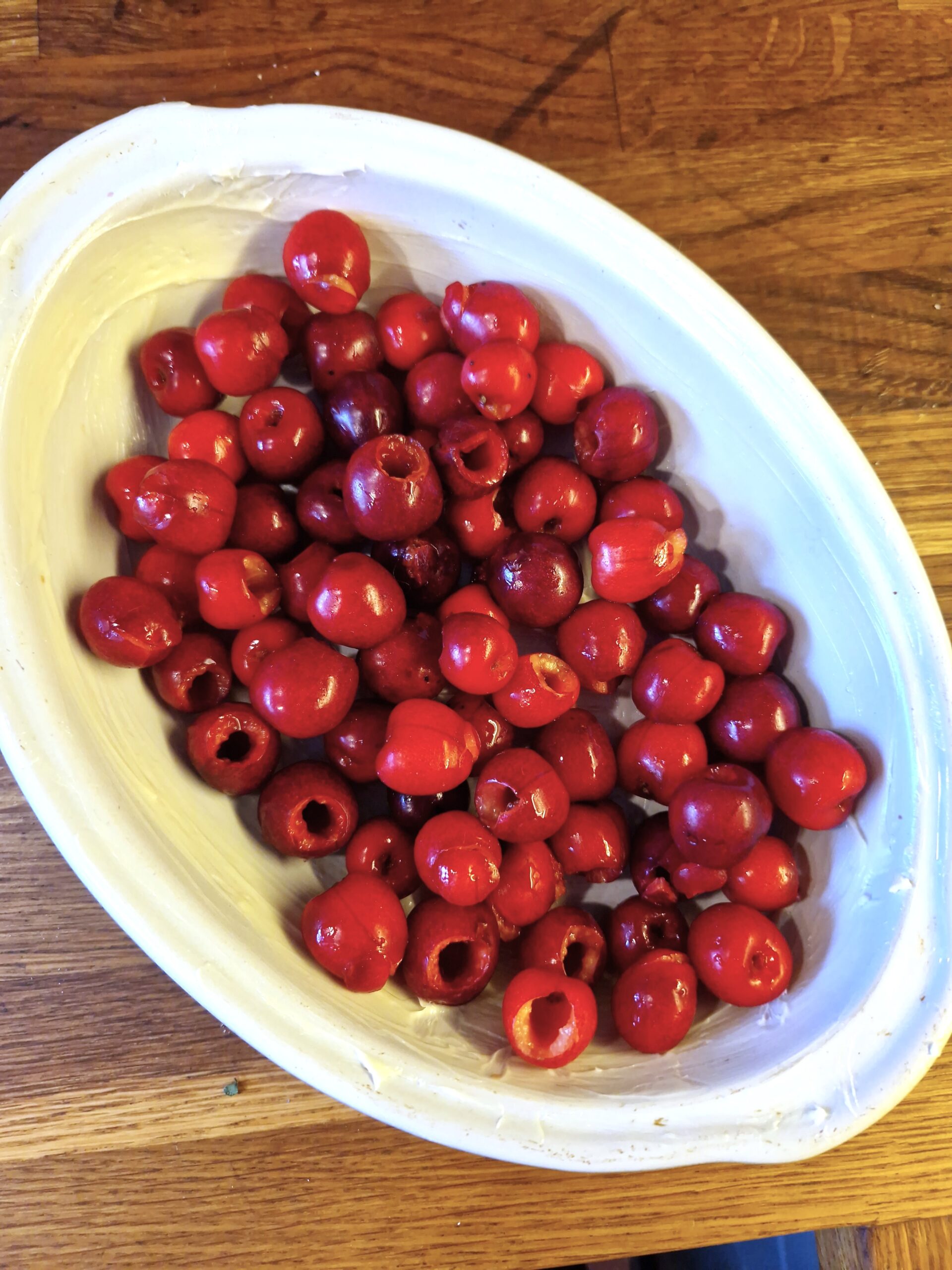 2. Wash and pit the cherries.  Preheat the oven to 350 degrees F.