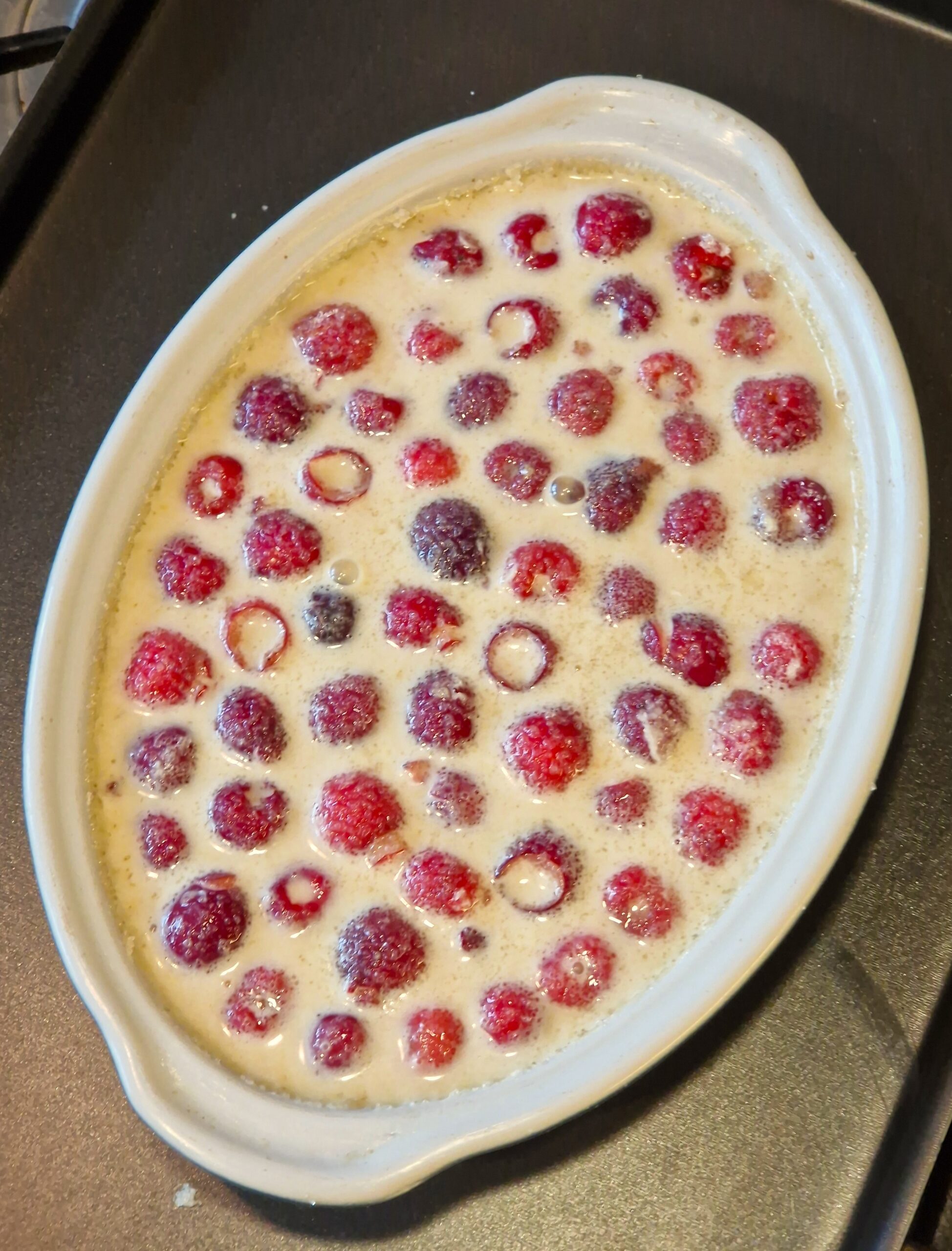 4. Arrange the pitted cherries in the pie dish.  Cover with the batter. Note the batter should just cover the fruit. Sprinkle the top of the batter with a little extra sugar.