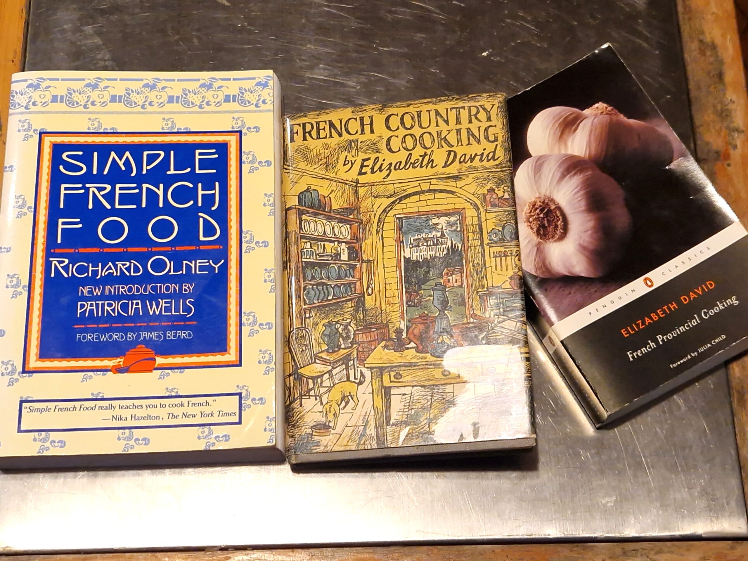 Richard Olney’s Simple French Cooking is les novel and more textbook. Almost technical in his approach and insistence on authenticity, his recipes can seem a bit daunting in their complication  and the amount of time required.  But country cooking sometimes consists of a number of steps that traditionally were integrated into the flow of the work day. The finished dishes shine in their simplicity.  When I worked at Campagne restaurant in the 1990’s, “Simple French Cooking” was the go-to source when we wanted the definitive, authentic version of a recipe. The house copy was so much used that the binding had cracked and the pages falling out. It was held together with a fat orange rubber band.  One of the gifts I took with me when I left Campagne to open Le Pichet was this old copy, which I kept for many years in a manila envelope. I finally bought a new copy when I could no longer keep the pages in order.