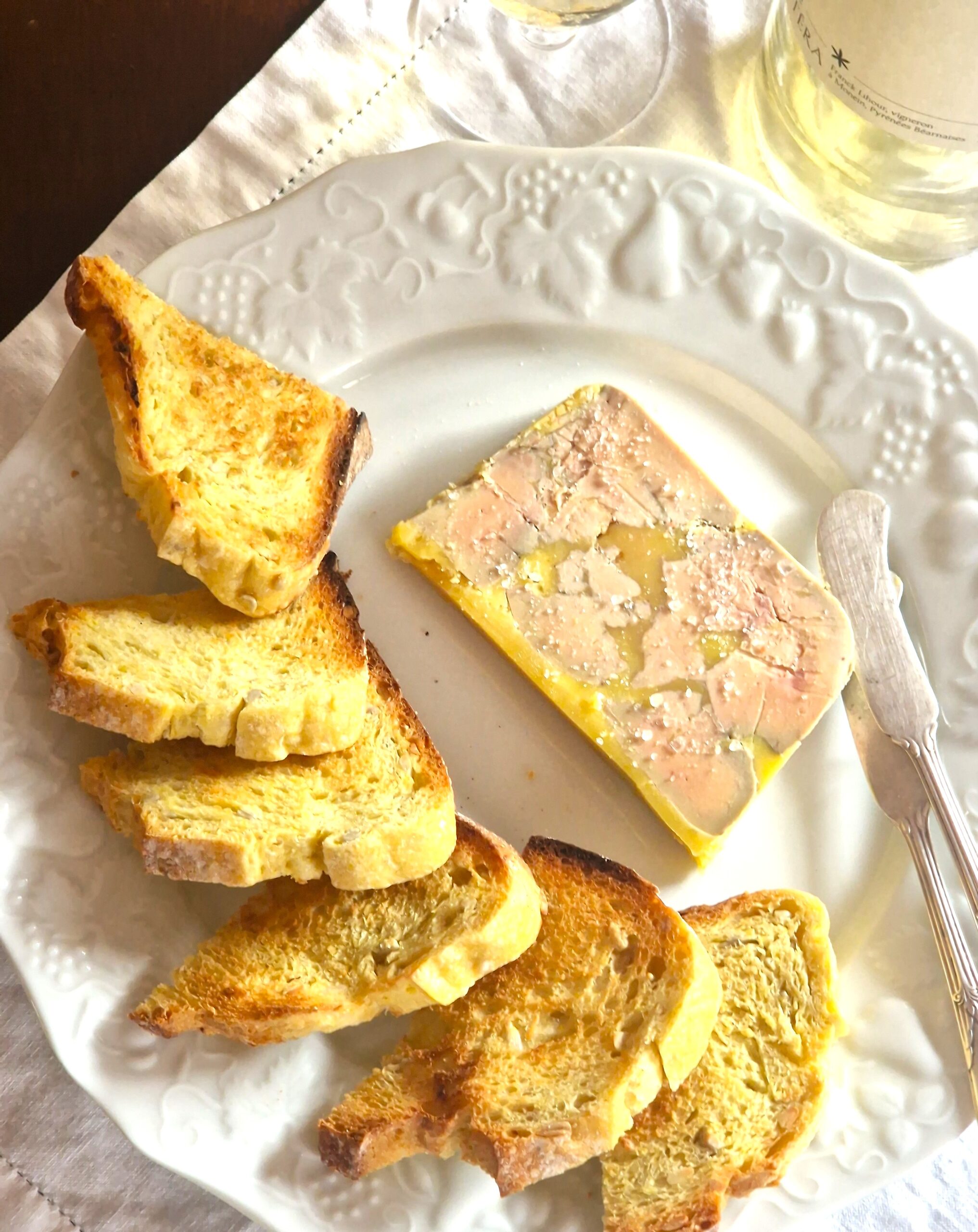 After smoked trout, we had my foie gras terrine “mi-cuit”, which is whole fattened duck liver, marinated overnight with a splash of port and spices, cooked to very low internal temperature, then pressed overnight again in the fridge. The low cooking temperature means that less of the fat is cooked out and therefore the liver maintains its silken texture. The success of this type of terrine is almost wholly dependent on the quality of the foie gras, so I took no chances and ordered weeks in advance from Maison Paris, a small scale producer located in the town of Pomerez in Les Landes, the heart of the southwest’s foie gras region and about 15 minutes north of Orthez. Foie gras has been hard to come by (and expensive when found) the last few years, due to the bird flu epidemic that swept the region and seriously damaged both artisan and larger farms. The good news is that near universal vaccination of ducks has meant more foie gras and of better quality, and less pricey! Add toasted brioche and maybe a spoonful of fig jam and the terrine is ready. We enjoyed it with a bottle of Jurançon from Domaine Castera.