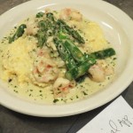 The special du jour at Cafe Presse this evening, Saturday June 22, 2013, while it lasts, hopefully tomorrow Sunday June 23 as well: “Saute of Gulf shrimp, sweet onions and asparagus finished with brandy and dandelion pistou, served on creamy black currant polenta”