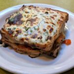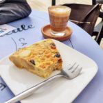 Petit déjeuner, Basque-style, one recent morning at a table outside the covered market in Biarritz. A good strong noisette (we would call that a macchiatto I think), plus a warm slice of tortilla espagnole, the famous egg and potato frittata that is often served as a pintxo in the Pays Basque.