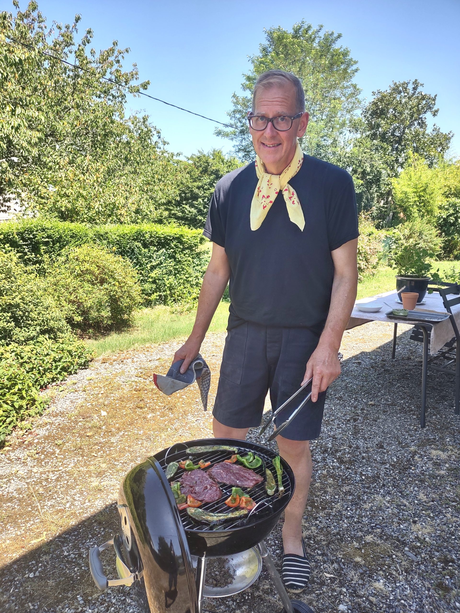 Happy Bastille Day everyone!  Here I am firing up the Weber and doing some BBQin’ for two: steak, peppers, eggplant, tomatoes, and more, all washed down with a nice bottle of Burgundy!  It is 36 degrees C here (which equals VERY HOT in degrees F), which explains the bandana.