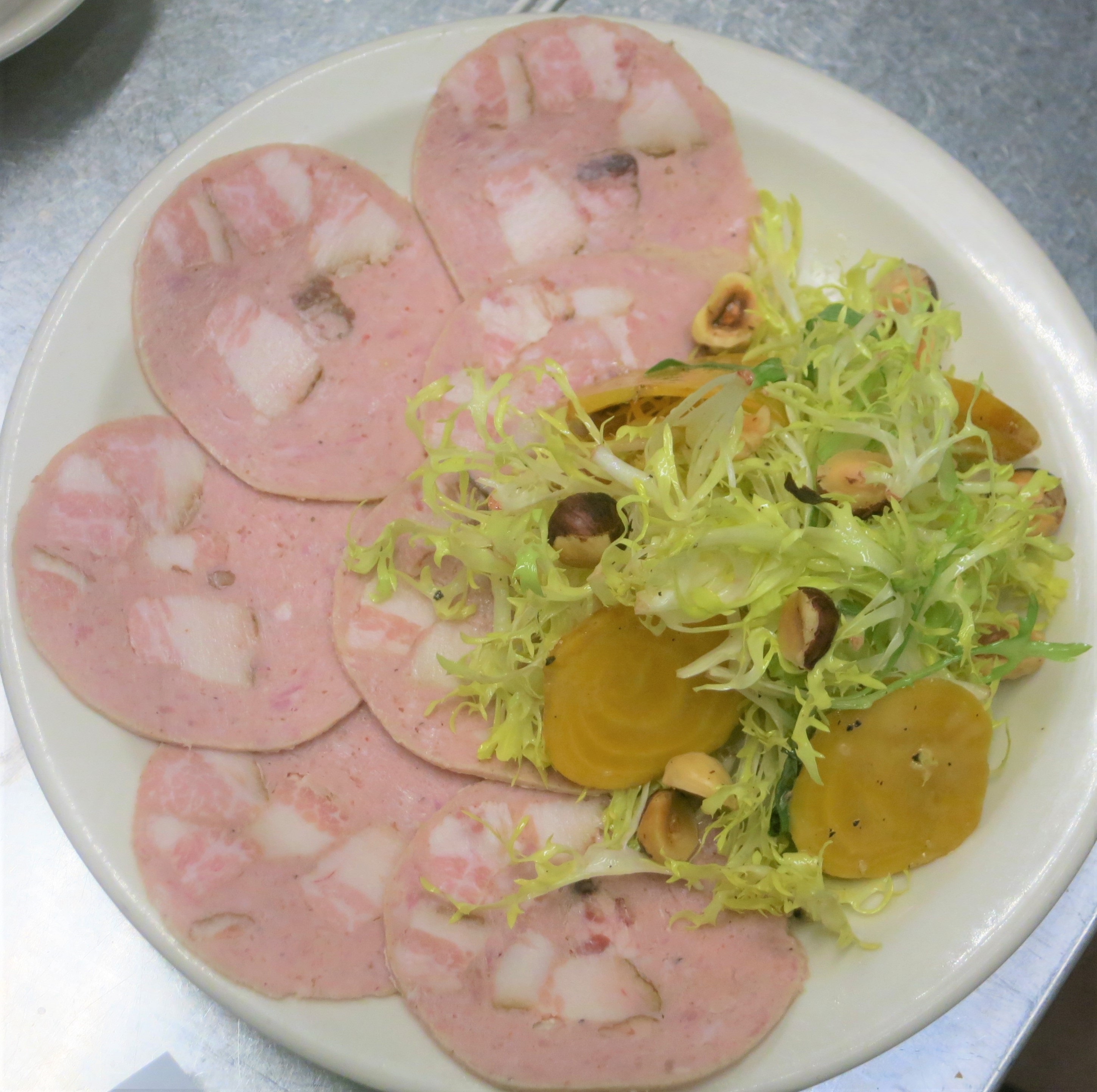 Special tartine today at Café Presse: grilled pistachio-pork sausage and melted Cantal on country bread, served with a salad of endives, pistachios, oranges and pistachio vinaigrette
