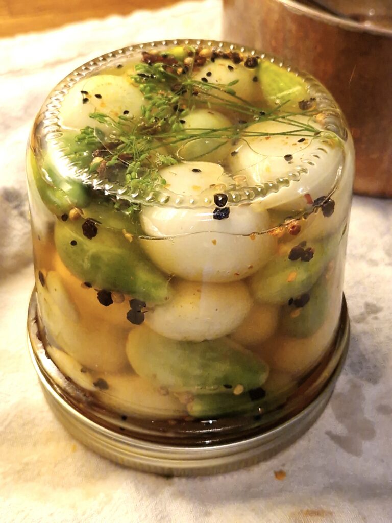 I tasted my green cherry tomato-pearl onion pickles recently and I think they turned out very well. So I am passing on the recipe. Note that this same method could be used for many veggies, such as green beans, cabbage and cauliflower.