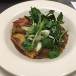 Now on the menu for both lunch and dinner: Millas gascons au confit de porc, salade de cresson et oignons verts Pan roasted cornmeal porridge cake with ground pork and pork confit, with grilled mushroom velouté and watercress-spring onion salad