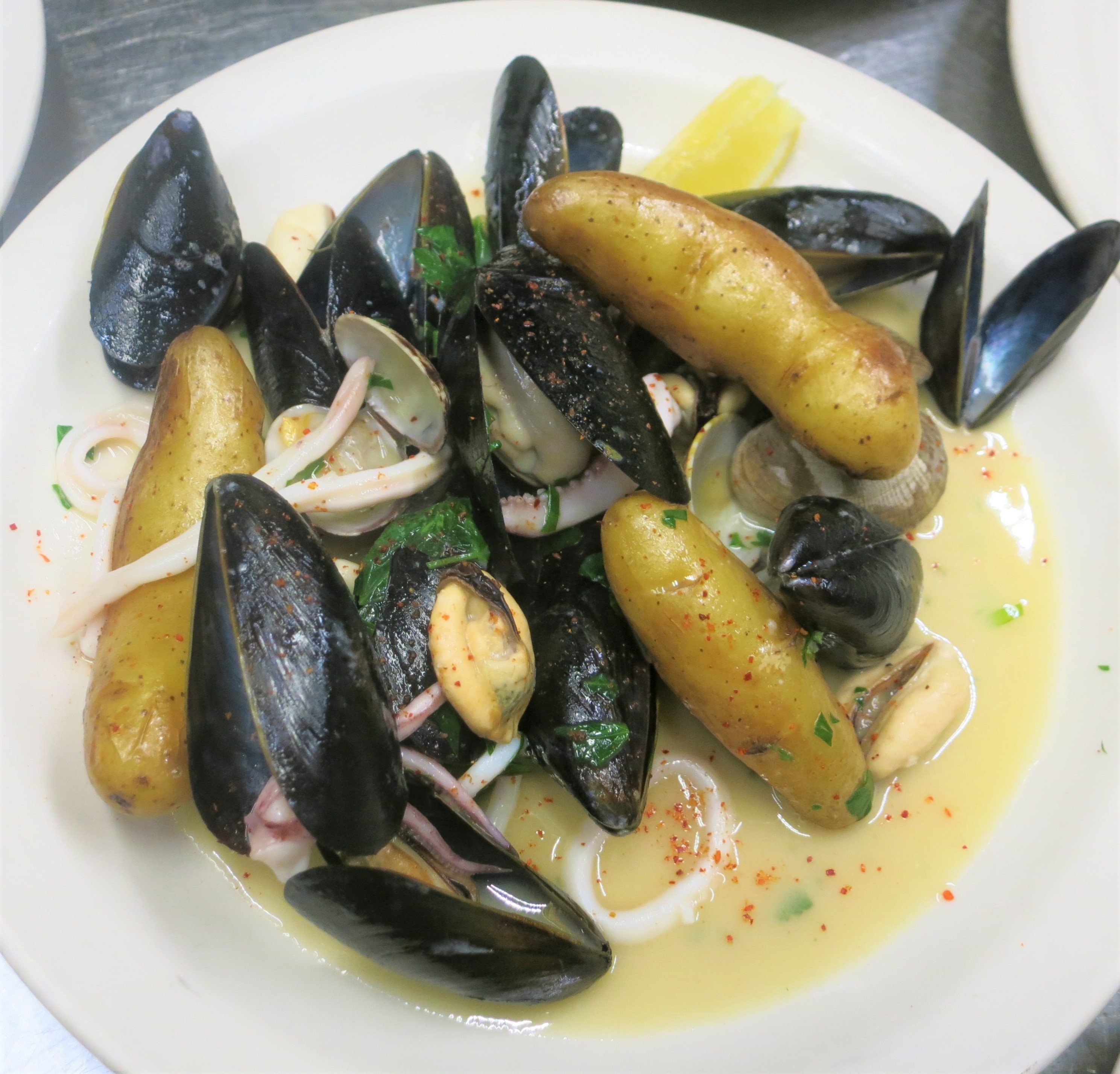 Just added to the Le Pichet menu by chef de cuisine Vince Hall: Calamari, Penn Cove clams and mussels seared with parsley, garlic, jambon de Bayonne, piment d’Espelette and olive oil, with duck fat fingerling potatoes and a lemon wedge. Fresh seafood simply seared on a plancha then tossed with persillade – a mixture of