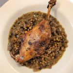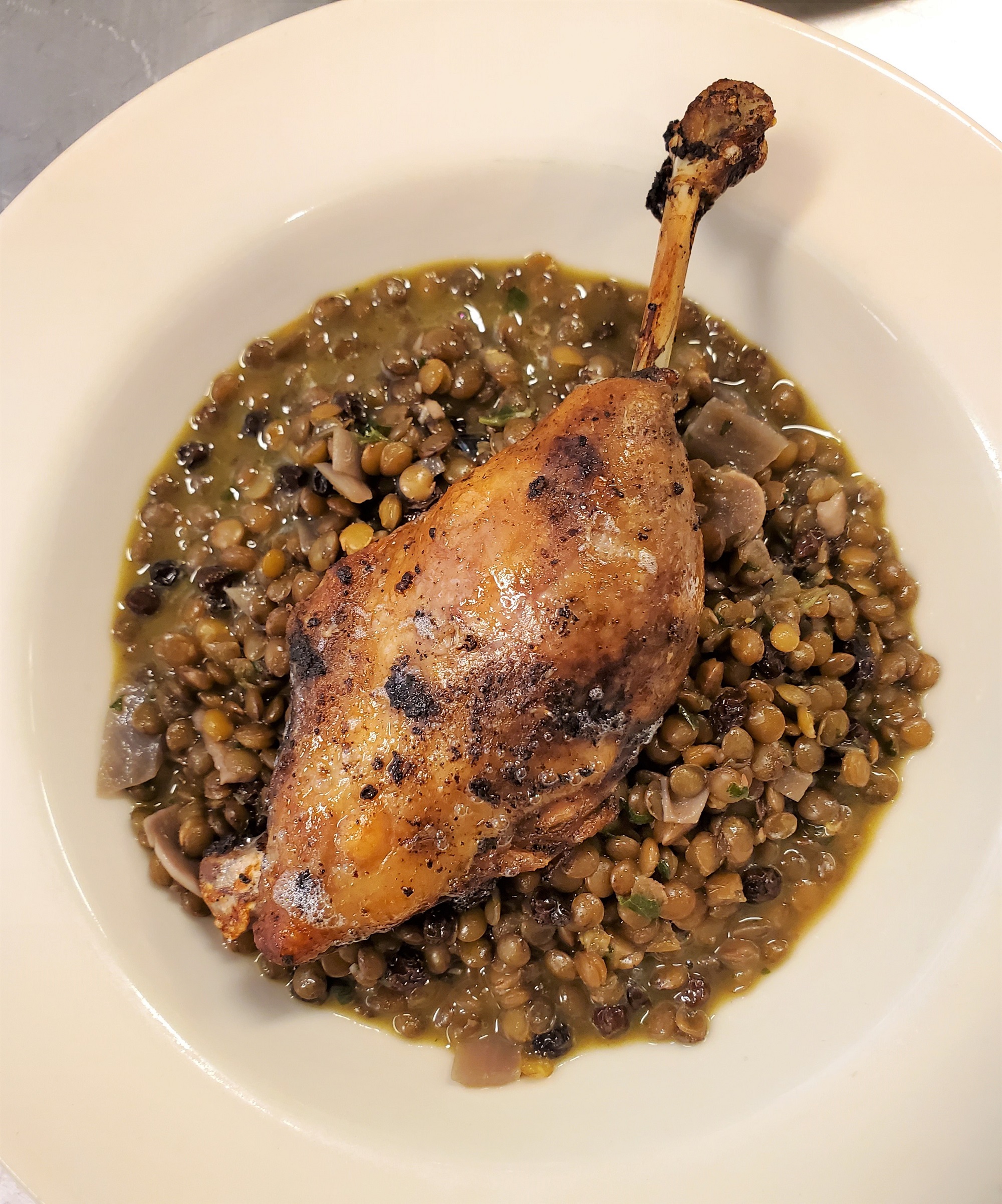 Special this afternoon at Café Presse the afternoon of Sunday 6/14: Crispy leg of duck confit served on a ragout of French green lentils simmered with brandy macerated black currants, parsley and garlic