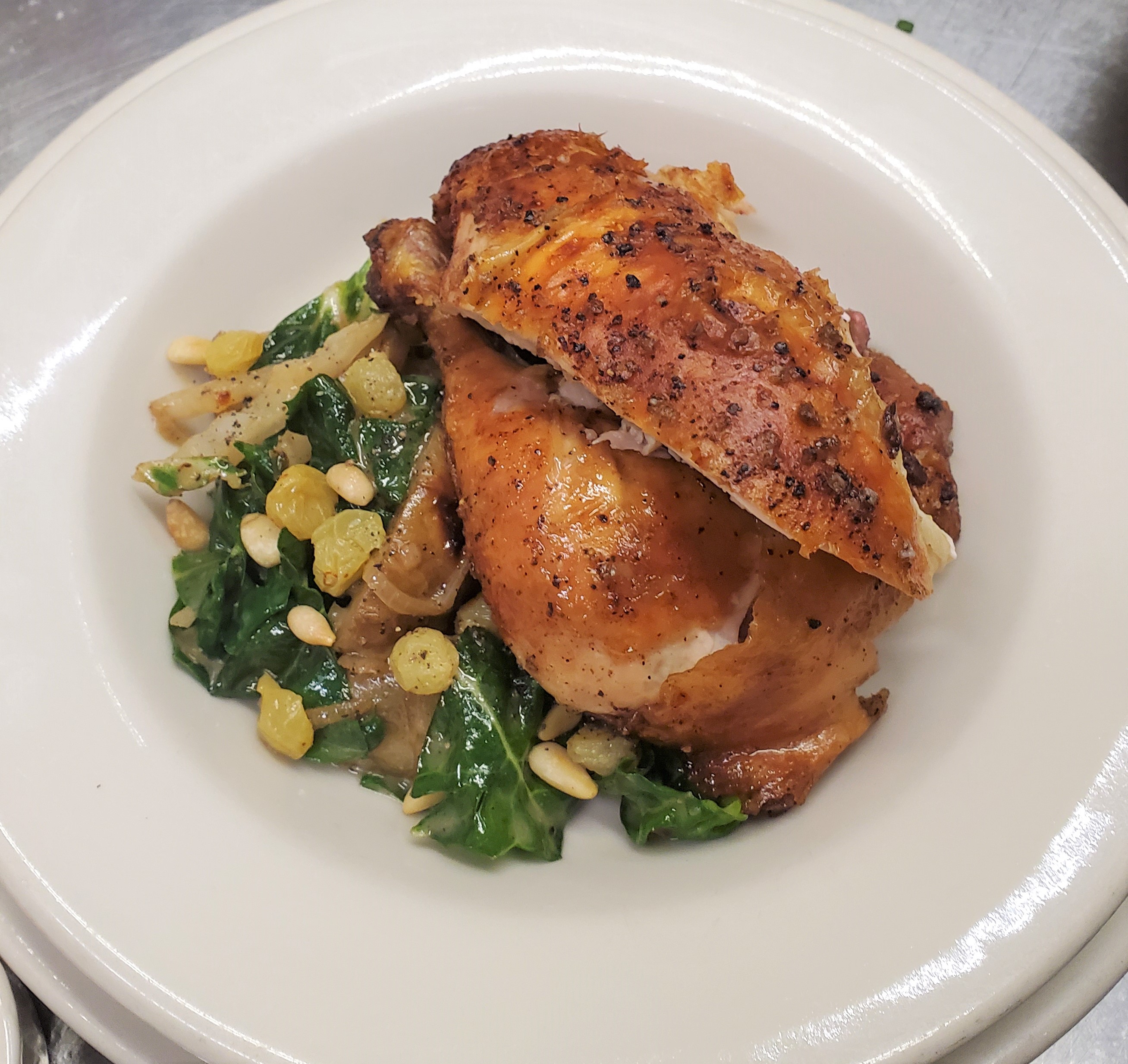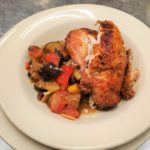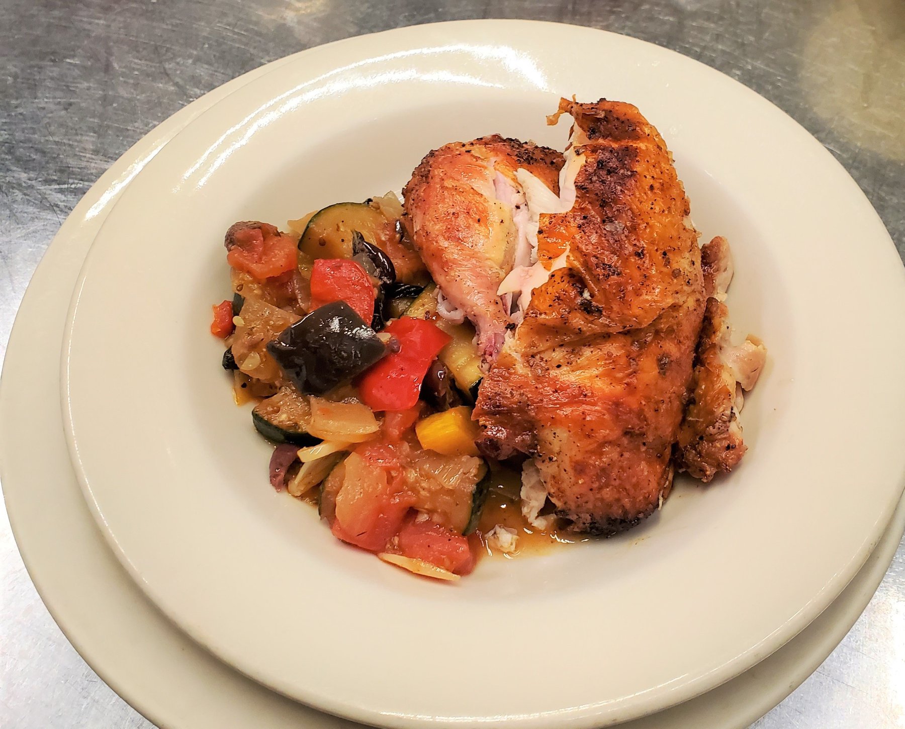 Our famous whole roasted WA State chicken for two served with Provençal vegetable stew with summer squashes, eggplant, tomato, onion, sweet peppers, garlic, olive oil and basil