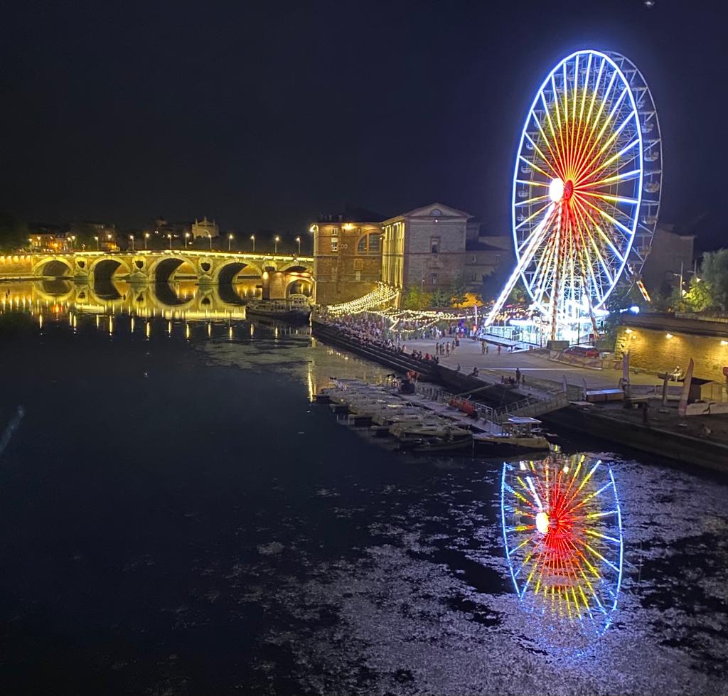 Thanks to Doug McDonnal for this great photo of the Pont-Neuf in Toulouse on a very hot August evening. On the quai near the bridge, you can see the Grand Roue (Great Wheel) and the Racines X Guingette, a sort of pop-up summer bar and restaurant where people gather to savor the cool breezes off